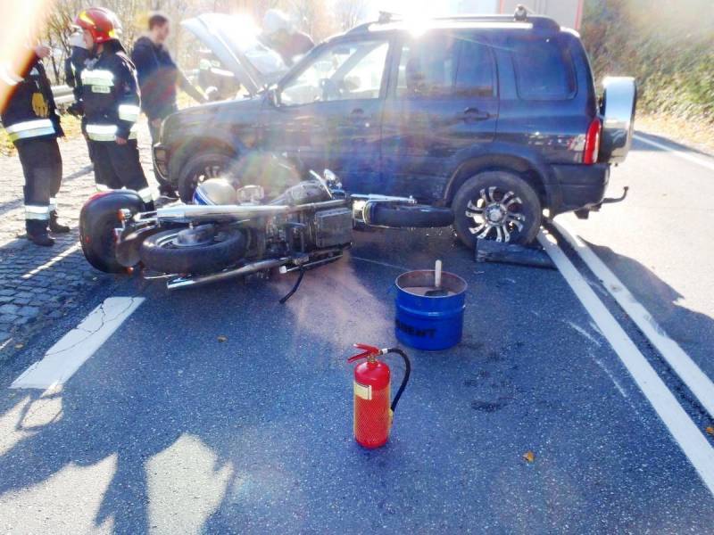 –Po przybyciu na miejsce zdarzenia ustalono, że w zdarzeniu uczestniczyły dwa pojazdy tj samochód osobowy Suzuki Grand Vitara oraz motocykl –relacjonują strażacy z PSP Nowy Sącz –Pojazdami podróżowali sami kierujący. W wyniku zdarzenia obrażenia odniósł kierowca motocykla. Poszkodowany znajdował się pod opieką załogi karetki Pogotowia ratunkowego.Działania strażaków polegały na zabezpieczeniu miejsca zdarzenia, odłączeniu akumulatorów w pojazdach, kierowaniu ruchem pojazdów w sposób wahadłowy, dokonaniu sorpcji rozlanych płynów eksploatacyjnych oraz usunięciu pojazdów i elementów pokolizyjnych na pobocze drogi. Karetka przewiozła osobę poszkodowaną do szpitala. Działania strażaków trwały dwie godziny.