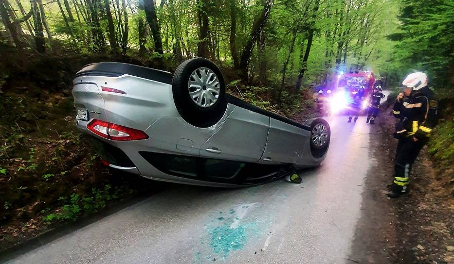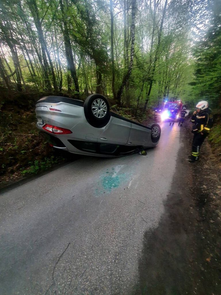 W chwili, kiedy ratownicy dotarli na miejsce zdarzenia drogowego, samochód osobowy, rozbity i leżący kołami do góry, całkowicie tarasował wąski lokalny trakt prowadzący przez las na stromym zboczu góry.