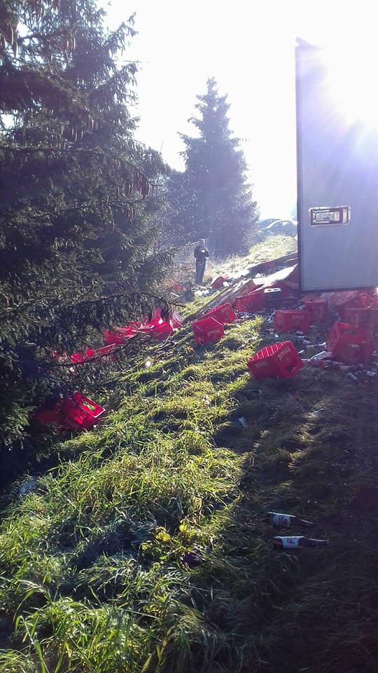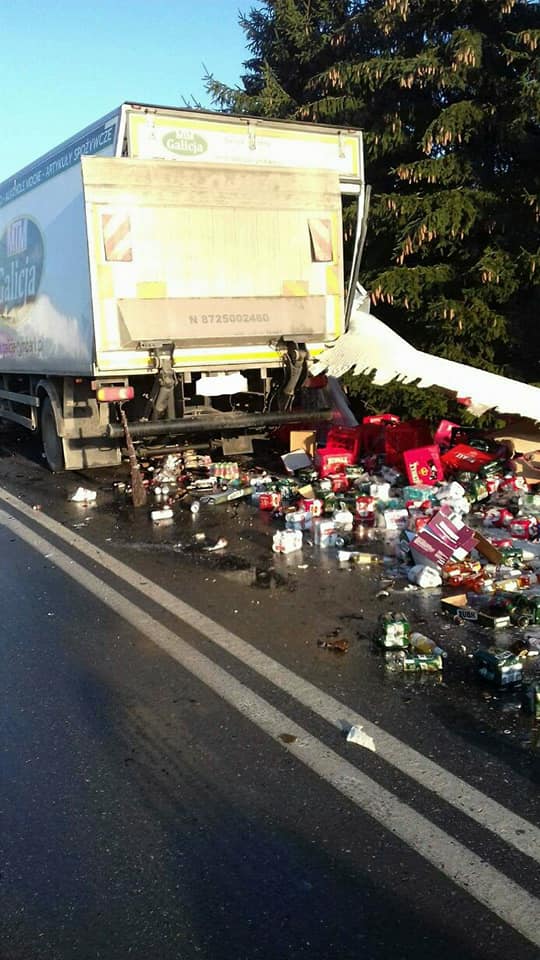 W wyniku zderzenia z wnętrza ciężarówki wypadł ładunek….piwo. Droga była całkowicie nieprzejezdna. Sprzątaniem jezdni zajęli się strażacy.