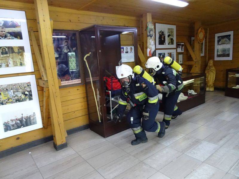 Dla potrzeb ćwiczeń przyjęto, że około godziny 15:00 do Stanowiska Kierowania Komendanta Miejskiego PSP w Nowym Sączu, wpłynęło zgłoszenie o wydobywającym się dymie oraz płomieniach w dolnej części ołtarza . Pracownicy wykonujący prace gospodarcze w pobliżu ołtarza podjęli  działania gaśnicze . Podczas próby gaszenia pożaru doszło do oparzenia oraz przytrucia wziewnego dwóch osób.