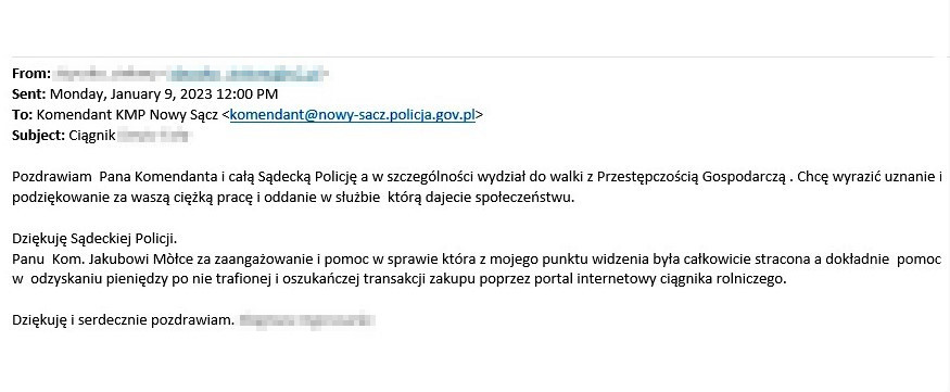 Mężczyzna w mailu skierowanym do szefa sadeckich policjantów wyraził wdzięczność za okazaną mu pomoc. Pozdrawiam Pana Komendanta i całą sądecką Policję, a w szczególności Wydział do walki z Przestępczością Gospodarczą. Chcę wyrazić uznanie i podziękowanie za Waszą ciężką pracę i oddanie w służbie, którą dajecie społeczeństwu. Dziękuję sądeckiej Policji i Panu kom. Jakubowi Mółce za zaangażowanie i pomoc w sprawie, która z mojego punktu widzenia była całkowicie stracona, a dokładnie za pomoc w odzyskaniu pieniędzy po nietrafionej i oszukańczej transakcji zakupu poprzez portal internetowy ciągnika rolniczego. – pisał w wiadomości sądeczanin.