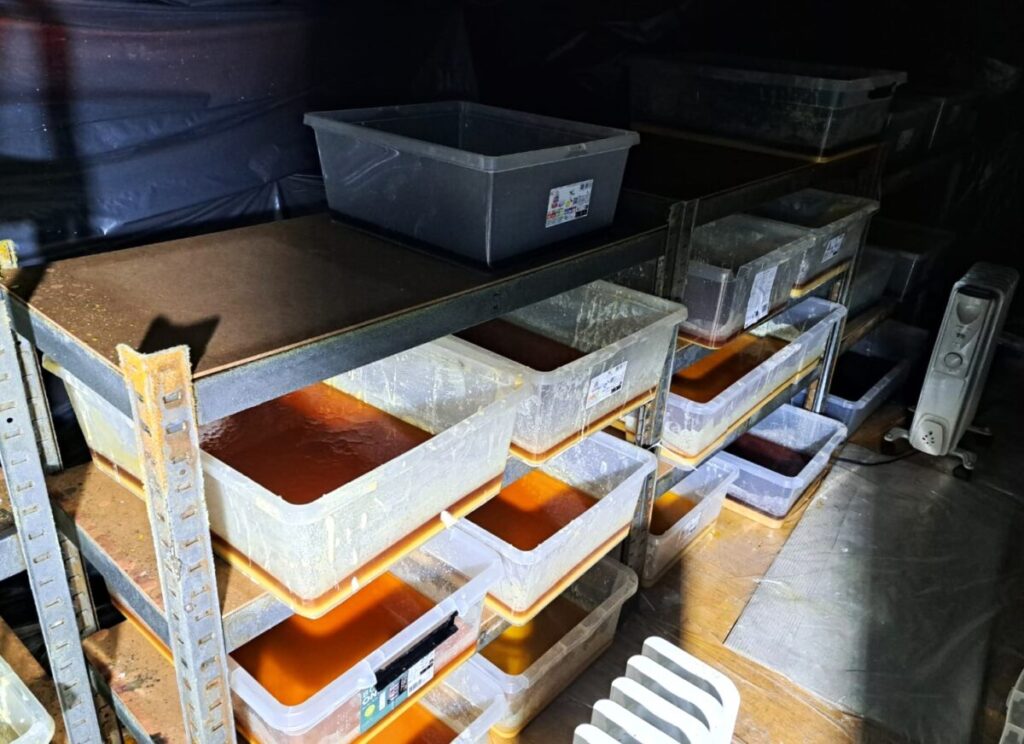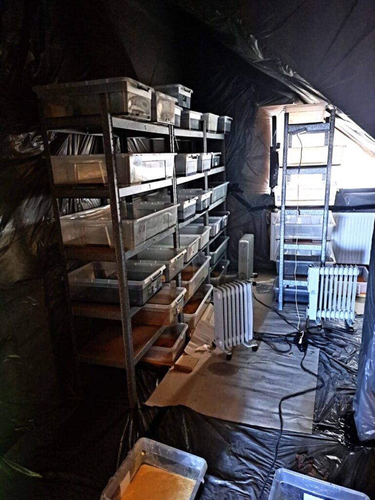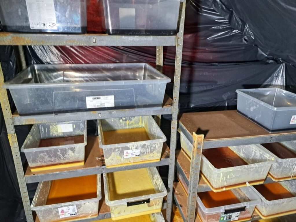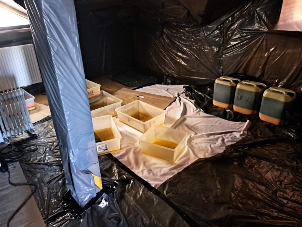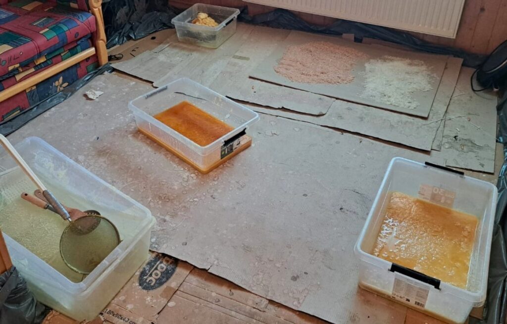 W toku dalszych czynności, w jednym z budynków policjanci ujawnili także laboratorium, w którym trwała produkcja psychotropowego klofedronu. Pod nadzorem prokuratora i przy udziale biegłego z zakresu badań chemicznych Laboratorium Kryminalistycznego Komendy Wojewódzkiej Policji w Krakowie oraz funkcjonariuszy Wydziału dw. z Przestępczością Narkotykową KWP w Krakowie przeprowadzono oględziny, w trakcie których zabezpieczono łącznie ponad 13 800 porcji gotowego do sprzedaży klofedronu wartego ponad milion złotych, a także 542 kilogramy tej substancji w postaci płynnej oraz w trakcie procesu krystalizacji. Łączna „czarnorynkowa” wartość zabezpieczonych substancji została oszacowana na 22,5 miliona złotych.