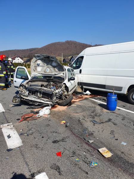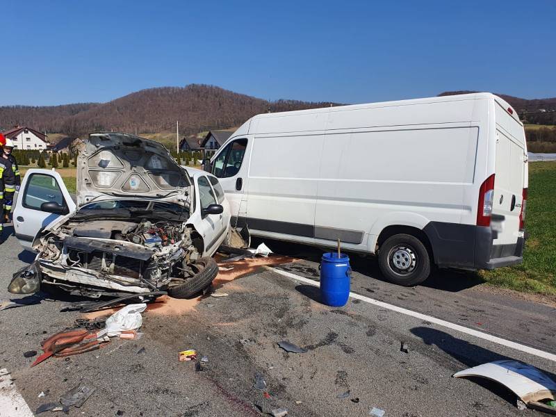 –Doszło do zderzenia trzech pojazdów, samochodu dostawczego Fiat Ducato, osobowego Renault Clio oraz ciężarowego Scania z naczepą. Fiatem Ducato podróżował tylko kierowca który nie uskarżał się na żadne dolegliwości. Pojazdem marki Renault podróżowały dwie osoby, które były zaopatrywane przez załogę karetki Pogotowia ratunkowego. Wszyscy uczestnicy zdarzenia opuścili pojazdy o własnych siłach -relacjonują strażacy –Ruch na drodze zablokowany był w obu kierunkach.Osoby poszkodowane podróżujące samochodem marki Renault zostały zabrane do szpitala. Pojazdy marki Fiat oraz Renault zostały zabrane z miejsca zdarzenia przez pomoc drogową, natomiast samochodem ciężarowym kierowca odjechał na pobliski parking. Ruch na drodze został przywrócony po zakończonych działaniach. Działania strażaków trwały prawie dwie godziny.