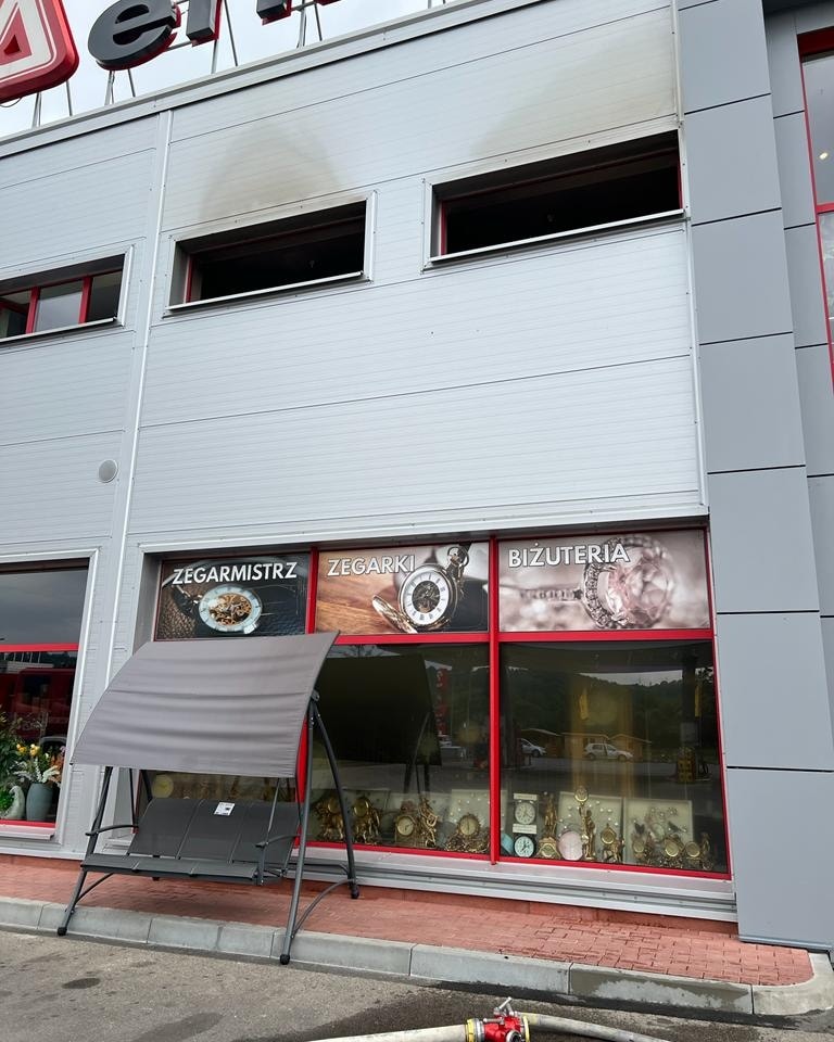 Po przybyciu na miejsce zdarzenia stwierdzono, że z dwóch okien Galerii Handlowej znajdujących się w górnej części budynku wydobywają się niewielkie ilości czarnego dymu. Na miejscu obecny był dozorca obiektu. Pożarem objęte było stanowisko handlowe z zegarkami oraz drobnym sprzętem elektronicznym, które znajdowało się na parterze.
