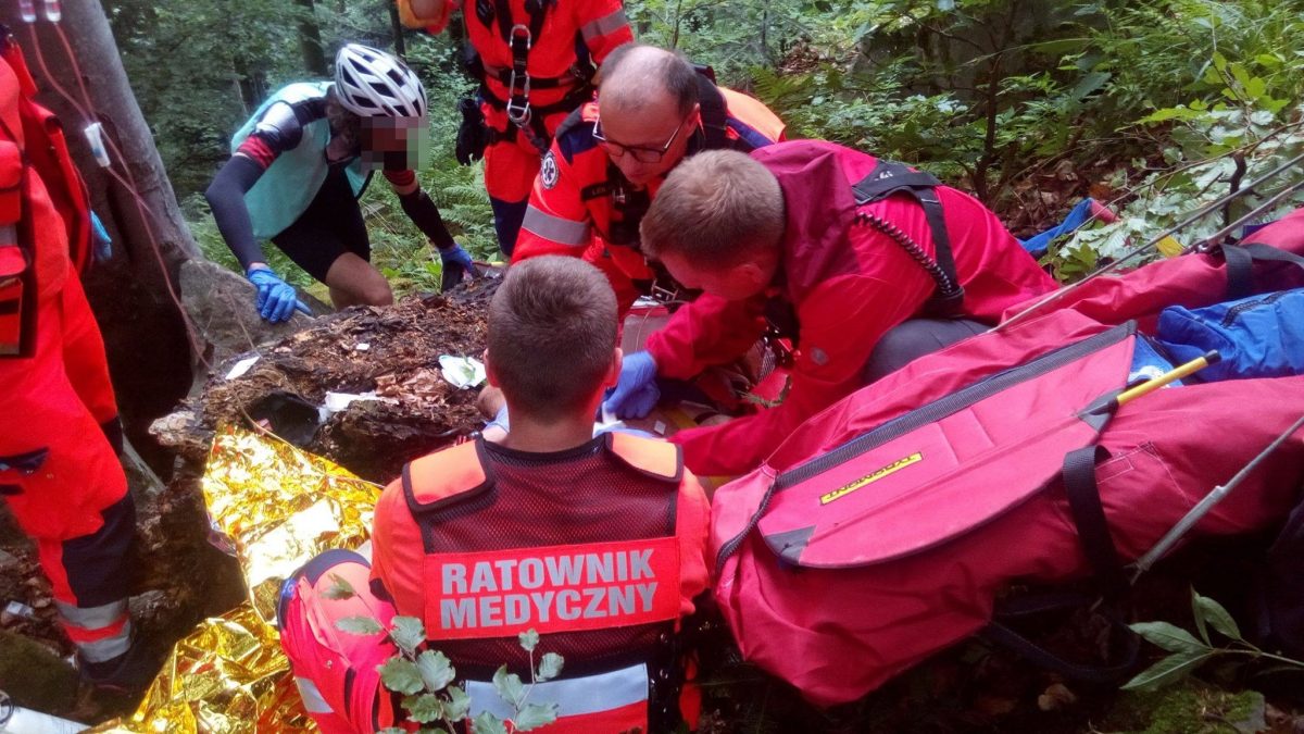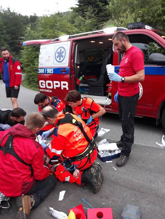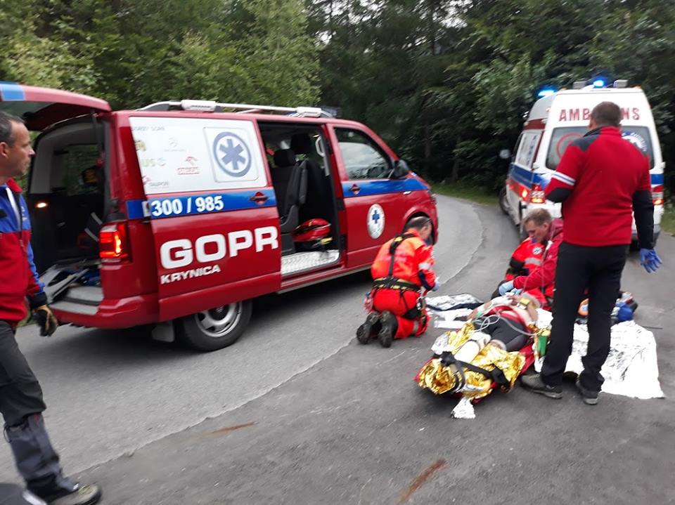 Po kilkunastu próbach dyżurny dodzwonił się do mężczyzny, jednak nie był on w stanie się poruszać. Okazało się, że jest ciężko ranny. Na miejsce wezwano  śmigłowiec Lotniczego Pogotowia Ratunkowego, który miał za pomocą technik linowych przejąć rowerzystę z trudno dostępnego miejsca. Okazało się to niemożliwe, więc goprowcy wydobyli poszkodowanego do drogi i przetransportowali na lądowisko na Przehybie. LPR zabrał rannego do szpitala w Krakowie.