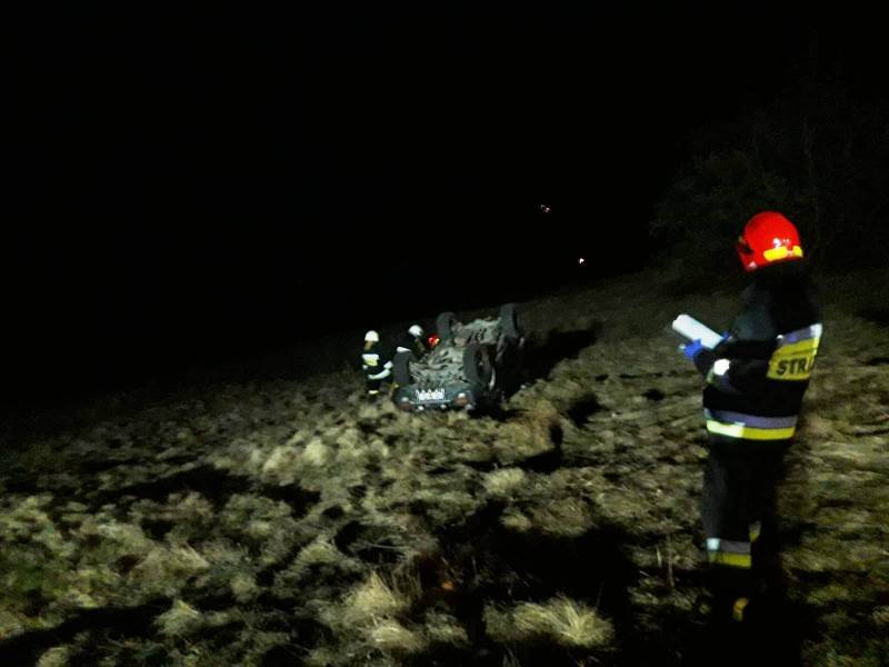 –Doszło tam do dachowania samochodu osobowego marki Nissan -relacjonują strażacy – Samochodem podróżowało pięć osób. Dwie z nich zostały poszkodowane. Pomocy osobom poszkodowanym udzielała załoga karetki pogotowia ratunkowego. Dwie osoby nie wymagały udzielenia pomocy medycznej. Jedna osoba oddaliła się z miejsca zdarzenia. Działania strażaków polegały na zabezpieczeniu oraz oświetleniu miejsca zdarzenia. Dodatkowo podjęto próbę znalezienia uczestnika zdarzenia, który wcześniej oddalił się w nieznanym kierunku. W tym celu przeszukano obszar o powierzchni około 3 ha – poszukiwanej osoby nie odnaleziono. Dwie osoby zostały zabrane do szpitala. Miejsce zdarzenia zabezpieczono taśmą ostrzegawczą, pojazd przekazano Policji. Na miejscu pozostał zastęp OSP Rytro oraz patrole Policji prowadzące czynności wyjaśniające okoliczności zdarzenia. Działania strażaków trwały cztery godziny.