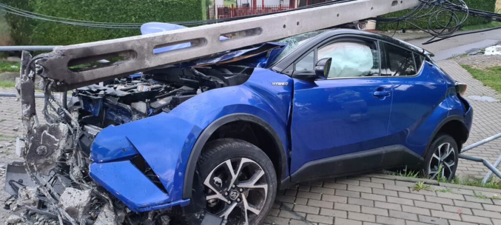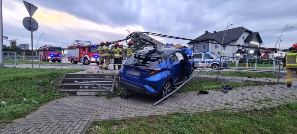 Po przybyciu na miejsce zdarzenia, stwierdzono, że samochód osobowy uderzył w betonowy słup, który złamał się i znajdował się na dachu pojazdu – informuje JRG nr 1 w Nowym Sączu.