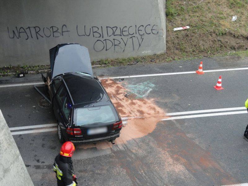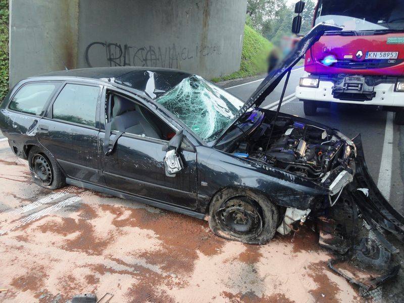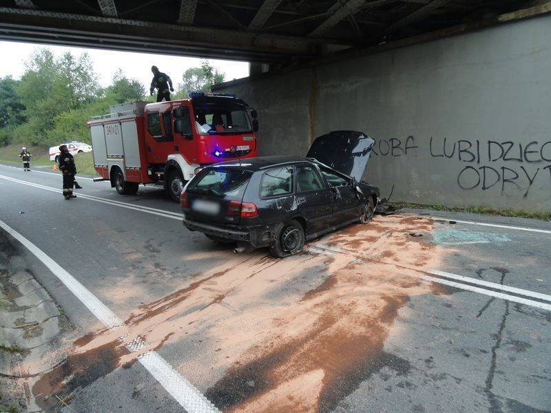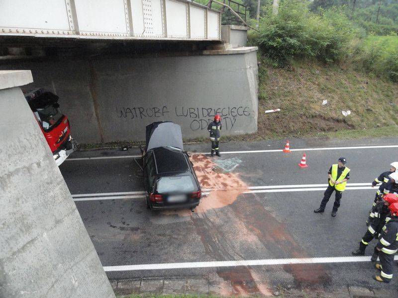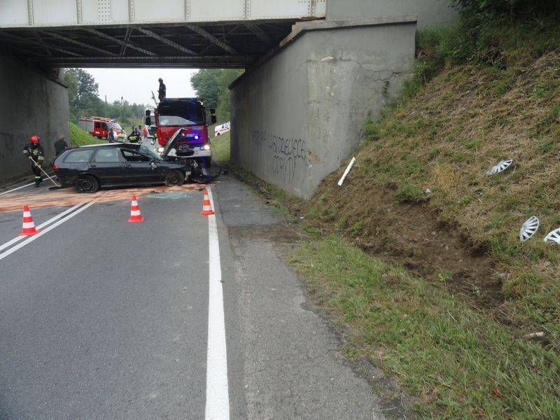 Dzisiaj 17 sierpnia kilkanaście minut przed godziną dziesiątą zastępy z JRG nr 1 w Nowym Sączu oraz z pobliskich OSP zadysponowane zostały do działań na drogę krajową w okolice Browaru w Siołkowej. Po przybyciu na miejsce zdarzenia ustalono, że samochód osobowy na łuku drogi wypadł z jezdni i uderzył w nasyp ziemny a następnie w betonowy filar mostu kolejowego.