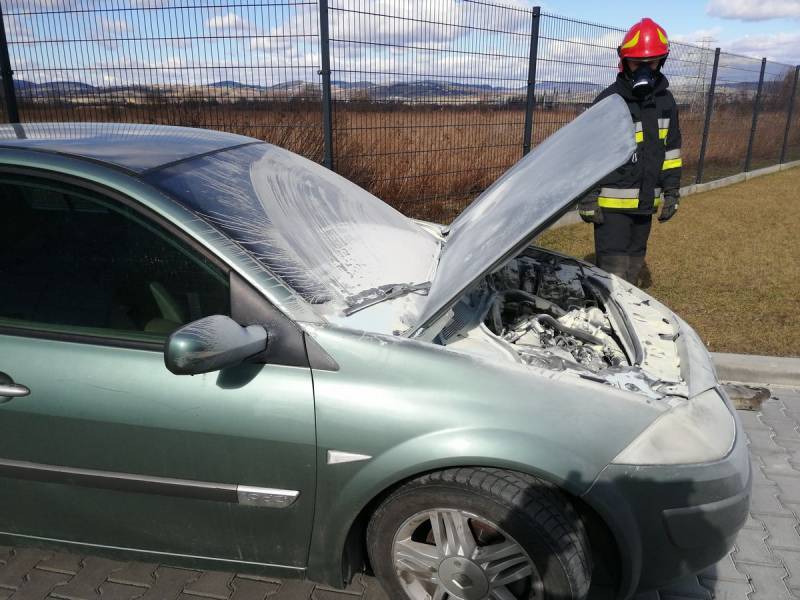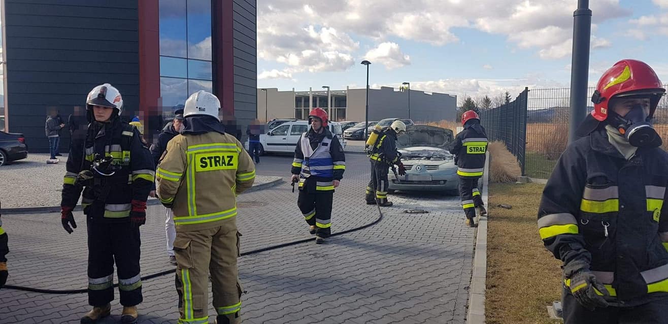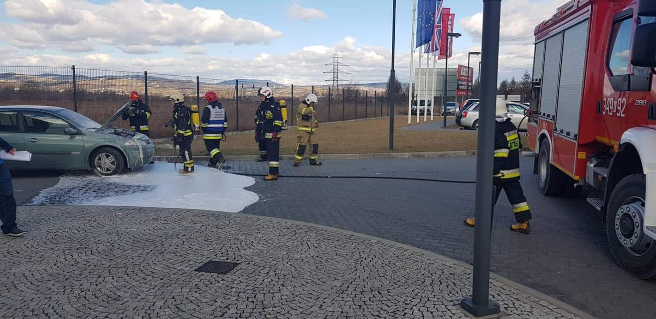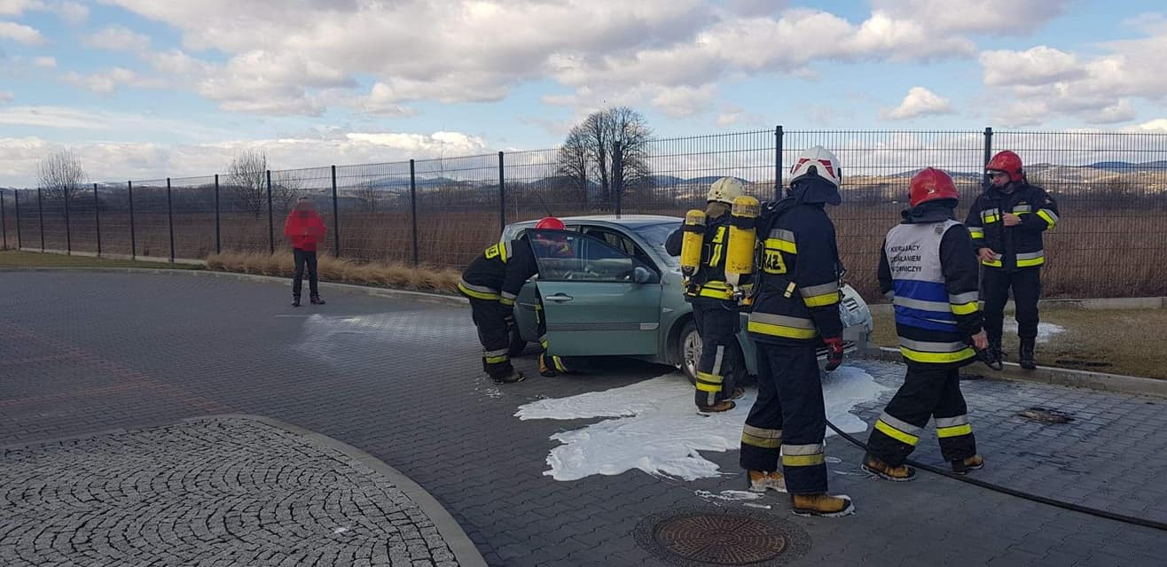 – Po przybyciu na zdarzenia ustalono, że na parkingu doszło do zapalenia się komory silnika samochodu osobowego marki Renault –relacjonują strażacy – Właściciel pojazdu znajdował się poza nim i nie uskarżał się na żadne dolegliwości. Samochód znajdował się w bezpiecznej odległości od innych zaparkowanych pojazdów. Właściciel jak i pracownicy firmy ugasili pojazd przed przybyciem zastępów Straży Pożarnej za pomocą pięciu gaśnic proszkowych. Działania strażaków polegały na zabezpieczeniu miejsca zdarzenia oraz podaniu piany ciężkiej na komorę silnika w celu wyeliminowania zarzewi ognia. Sprawdzono przedział pasażerski za pomocą kamery termowizyjnej. Prawdopodobną przyczyną pożaru była wada środku transportu.