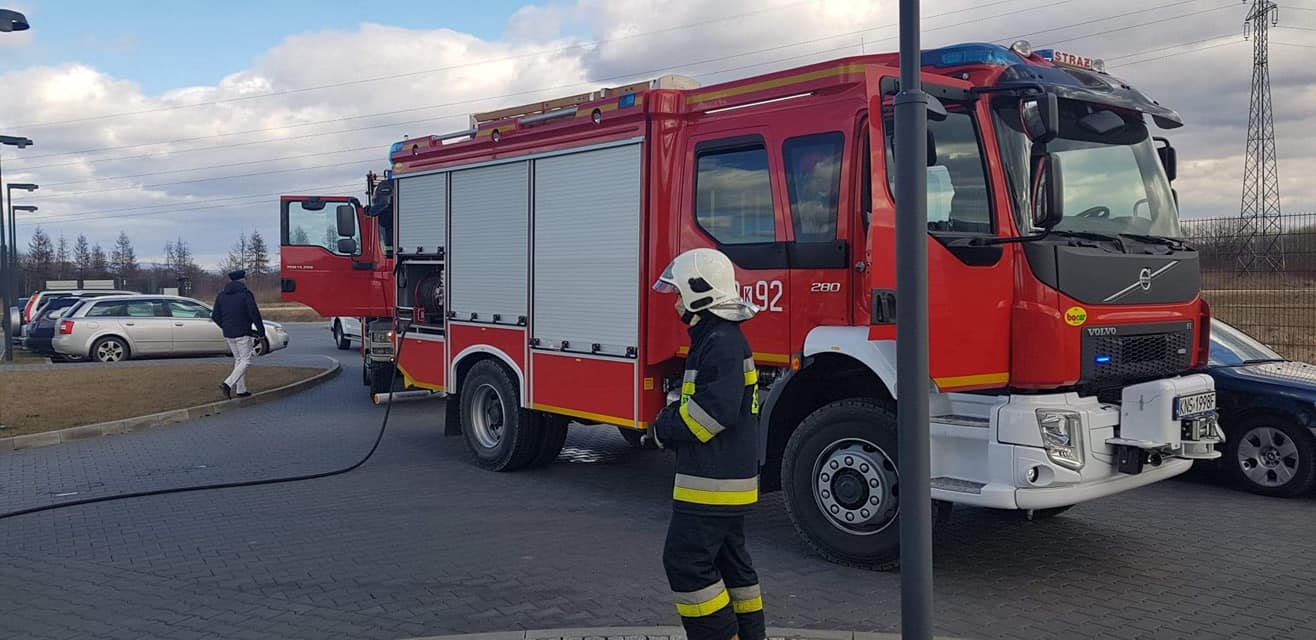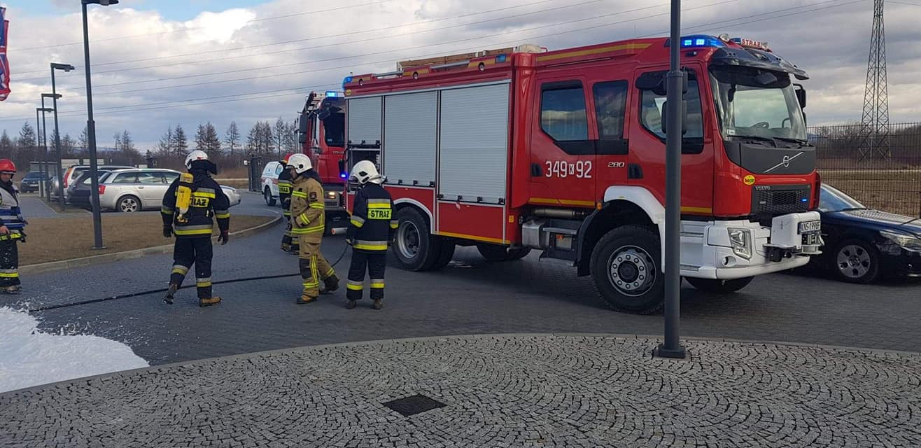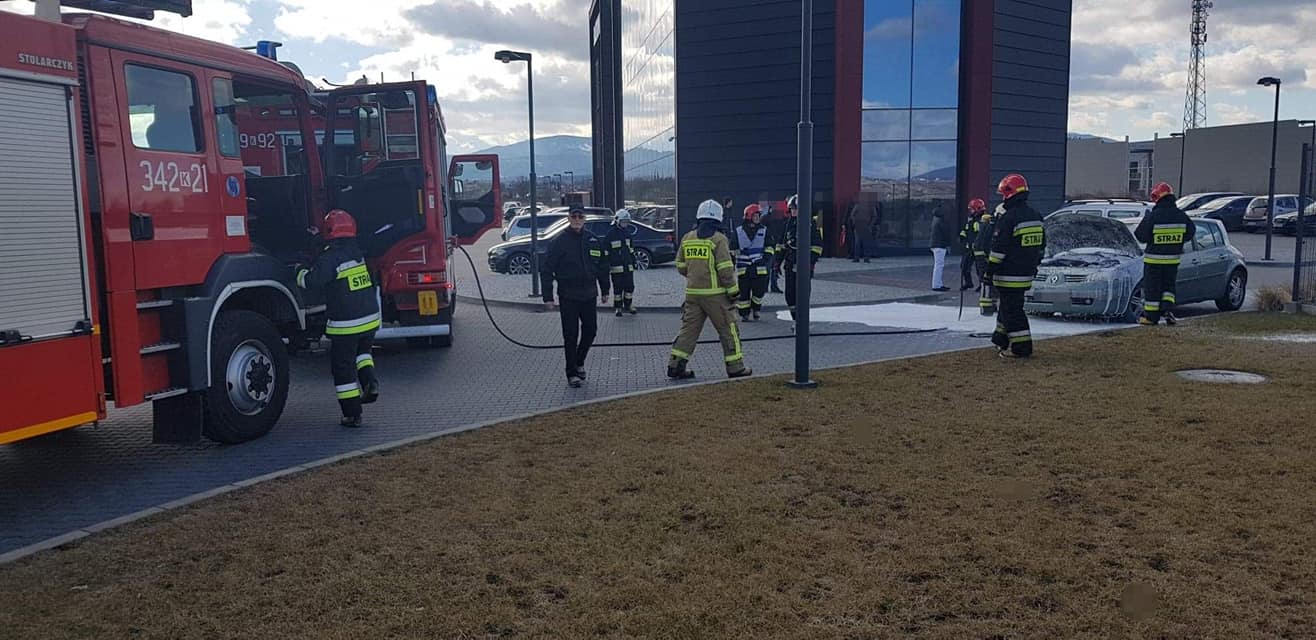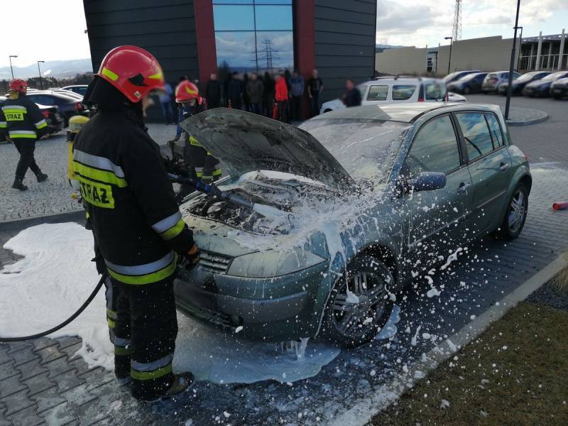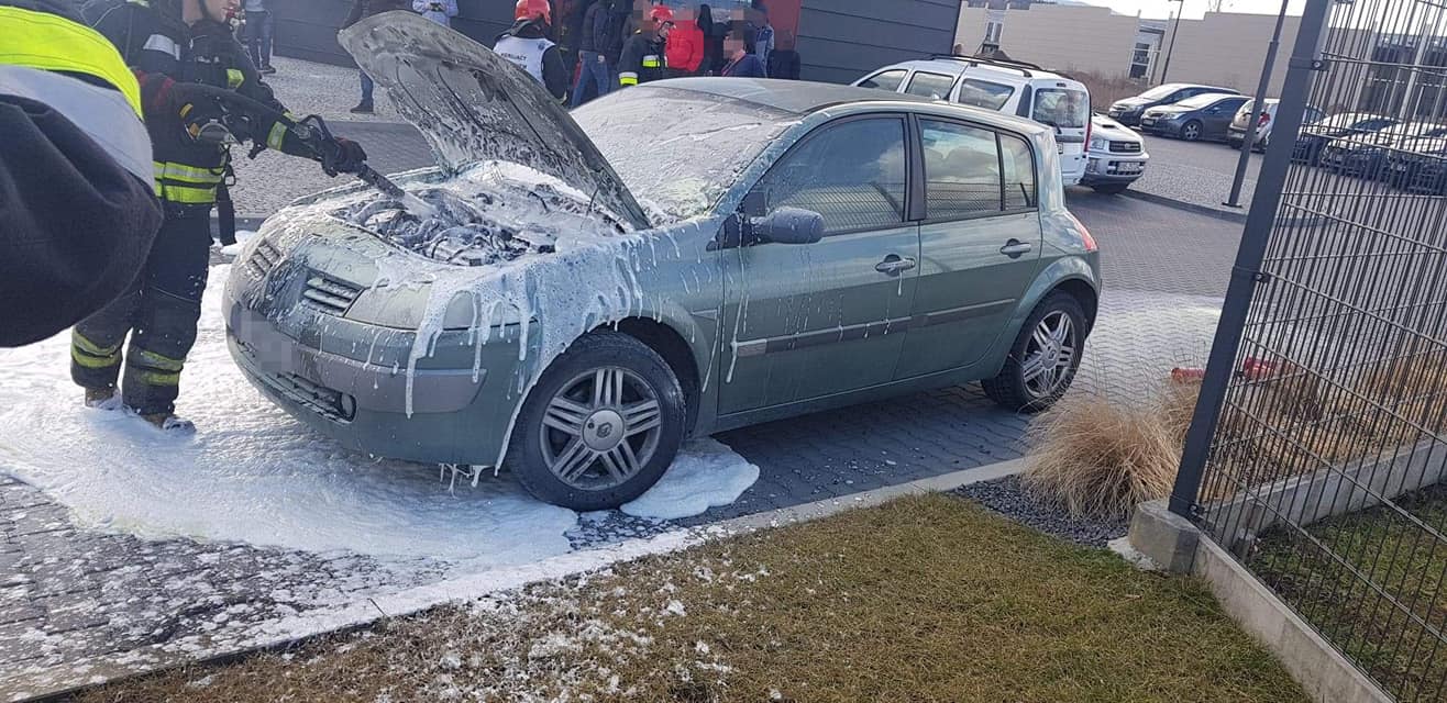 – Po przybyciu na zdarzenia ustalono, że na parkingu doszło do zapalenia się komory silnika samochodu osobowego marki Renault –relacjonują strażacy – Właściciel pojazdu znajdował się poza nim i nie uskarżał się na żadne dolegliwości. Samochód znajdował się w bezpiecznej odległości od innych zaparkowanych pojazdów. Właściciel jak i pracownicy firmy ugasili pojazd przed przybyciem zastępów Straży Pożarnej za pomocą pięciu gaśnic proszkowych. Działania strażaków polegały na zabezpieczeniu miejsca zdarzenia oraz podaniu piany ciężkiej na komorę silnika w celu wyeliminowania zarzewi ognia. Sprawdzono przedział pasażerski za pomocą kamery termowizyjnej. Prawdopodobną przyczyną pożaru była wada środku transportu.