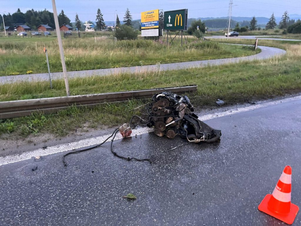 -Na miejscu zdarzenia znajdowała się karetka Pogotowia ratunkowego. Ratownicy udzielali pomocy jednej osobie. Druga osoba nie uskarżała się na żadne dolegliwości. Z jednego pojazdu wyleciał silnik, który znajdował się na jezdni. Obydwa pasy jezdni były zablokowane –relacjonuje rzecznik PSP – Jedna osoba została zabrana do szpitala. Działania strażaków trwały niespełna godzinę.