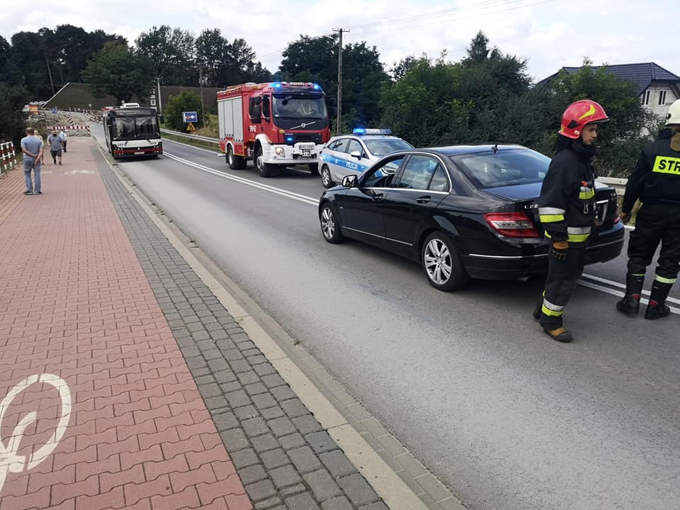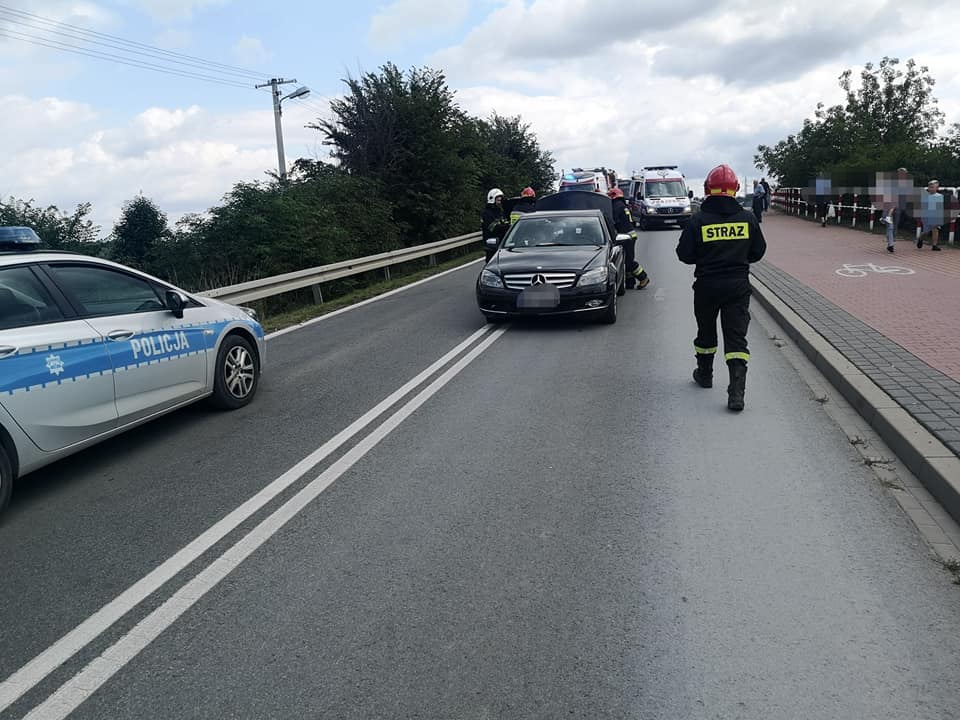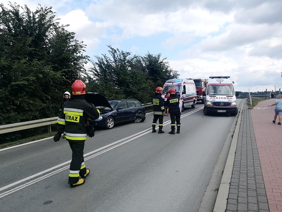 -Doszło do zderzenia dwóch samochodów osobowych tj. Mercedes C220 oraz Audi A4 -relacjonują strażacy –Samochodami podróżowało łącznie siedem osób w tym troje dzieci.  Przed przybyciem Straży Pożarnej pod opieką załogi karetki Pogotowia ratunkowego znajdowała się jedna osoba dorosła oraz dziecko. Po wstępnym przebadaniu przez ratowników obydwie osoby zostały przetransportowane do szpitala. W trakcie prowadzonych działań ruch na drodze był całkowicie zablokowany. Działania strażaków polegały na zabezpieczeniu miejsca zdarzenia, odłączeniu klem od akumulatora oraz  usunięciu pozostałości pojazdów z jezdni. Działania strażaków trwały prawie dwie godziny.
