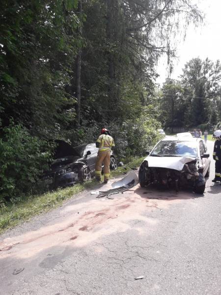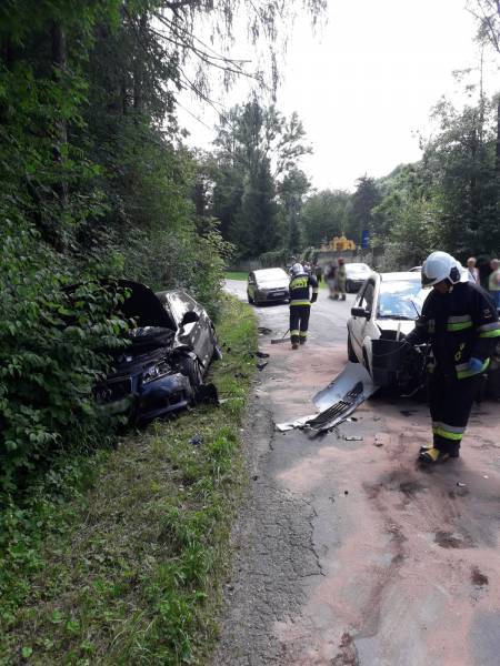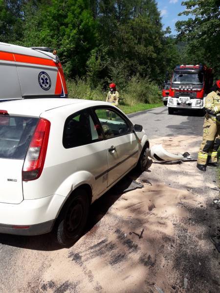 -Po przybyciu na miejsce zdarzenia ustalono, że doszło do zderzenia dwóch samochodów osobowych Ford Fiesta oraz Audi -relacjonują strażacy –W chwili przybycia zastępu Straży Pożarnej, Audi stało w płytkim rowie, a Ford stał na lewym pasie drogi. Osoby kierujące pojazdami opuściły je przed przybyciem strażaków. Jedna z nich znajdowała się pod opieką załogi karetki Pogotowia Ratunkowego i po przeprowadzonych badaniach została zabrana do szpitala. Policja prowadziła czynności wyjaśniające.