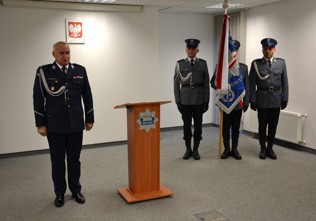 Podczas uroczystości szef sądeckich policjantów złożył nowym funkcjonariuszom gratulacje oraz życzył im licznych sukcesów w służbie.