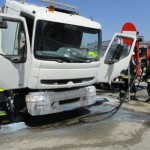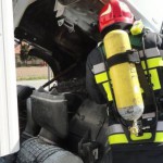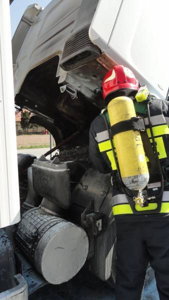 Mężczyzna kierujący samochodem ciężarowym przystąpił do gaszenia komory silnika gaśnicą proszkową. Po zlokalizowaniu pożaru podniósł kabinę samochodu oraz odłączył akumulator.