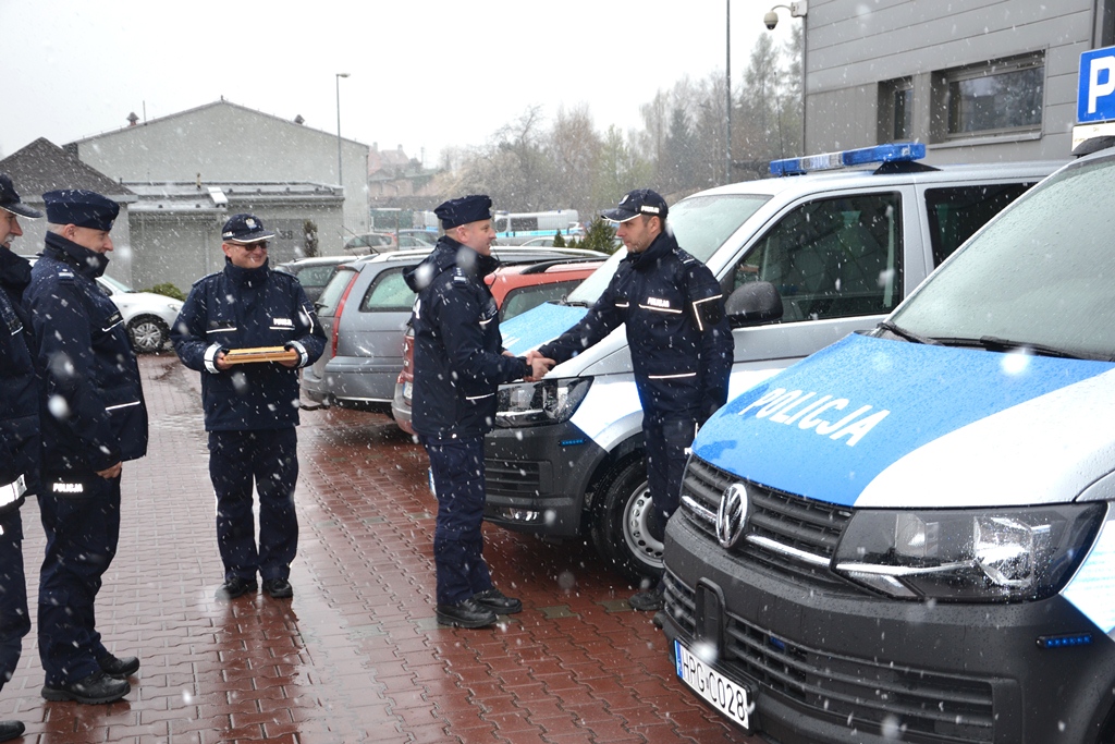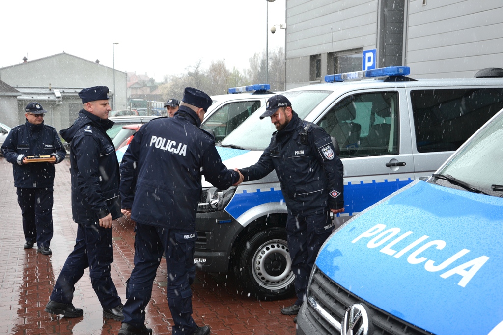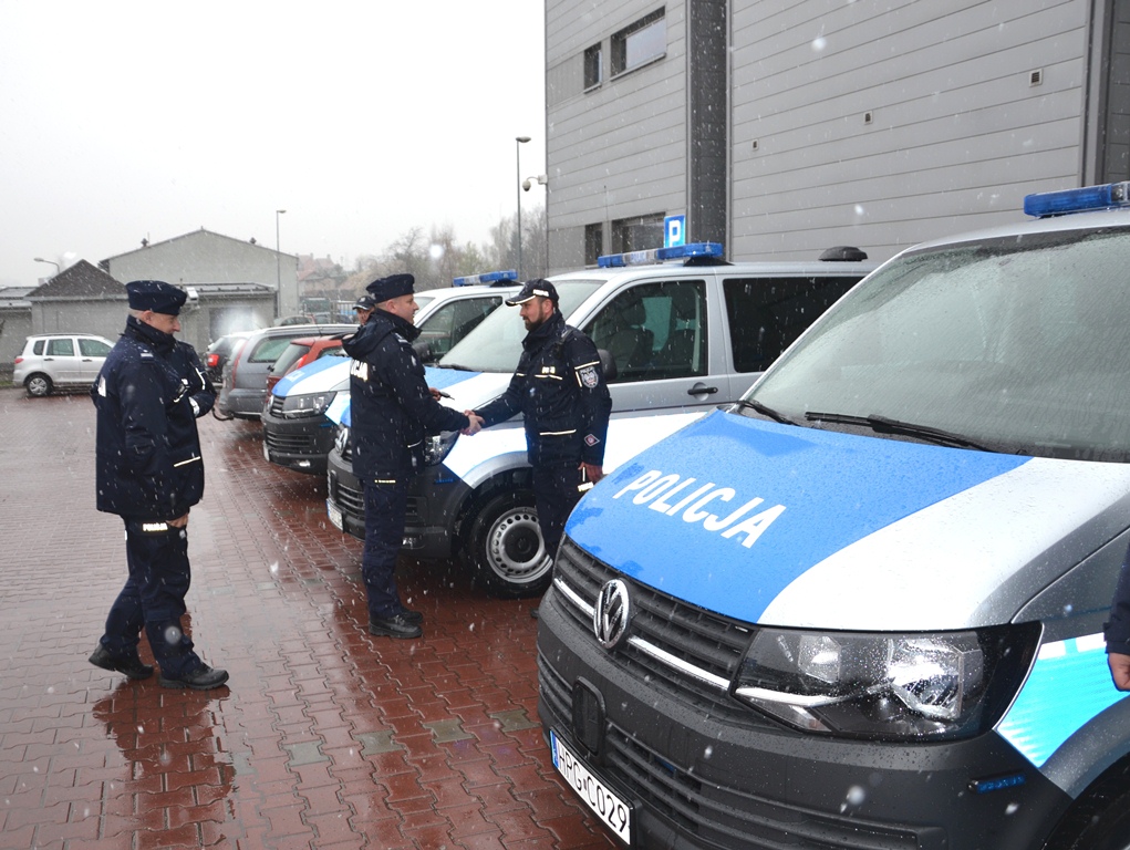Komendant Miejski Policji w Nowym Sączu, insp. Jarosław Tokarczyk w obecności pełniącego obowiązki jego Zastępcy, podinsp. Adama Bukańskiego, przekazał kluczyki i dowody rejestracyjne pojazdów funkcjonariuszom Wydziału Prewencji. To właśnie w tym wydziale samochody będą na co dzień użytkowane i zastąpią mocno wysłużone już fiaty Ducato, które mają blisko 400 tysięcy kilometrów przebiegu.