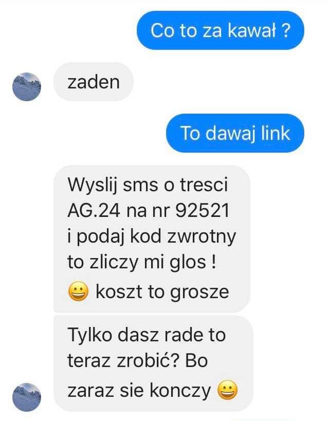 1 stycznia wieczorem ktoś włamał się na konto komunikatora internetowego mieszkanki powiatu nowotarskiego i rozsyłał fałszywe wiadomości o rzekomym udziale kobiety w noworocznym konkursie fotograficznym, prosząc jej znajomych o wysłanie smsa. W wiadomościach oszust wprowadził w błąd wszystkie osoby twierdząc, ze koszt smsa to grosze. Niektórzy wysłali sms myśląc, że pomagają znajomej. Jak się później okazało koszt takiego smsa to kwota ponad 30 złotych. Ponadto oszust podszywając się pod poszkodowaną prowadził korespondencję z osobami, do których wiadomość została wysłana zapewniając, że udział w konkursie to jak najbardziej prawda i prosił o wysłanie smsa.