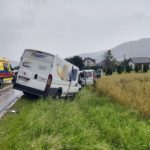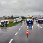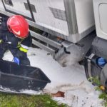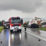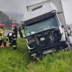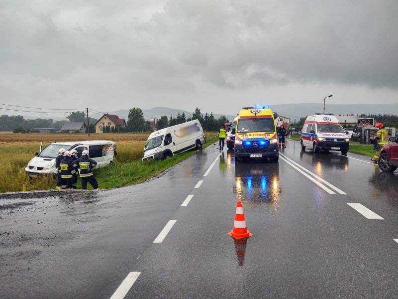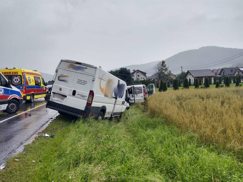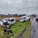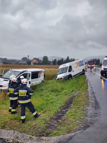 –Doszło do najechania na siebie dwóch samochodów dostawczych, w wyniku czego trzeci pojazd ciężarowy jadący z przeciwka, zjechał na pobocze i uderzył w przydrożny betonowy przepust –relacjonują strażacy – Wszystkie osoby biorące udział w zdarzeniu opuściły pojazdy o własnych siłach. Dwie osoby znajdowały się na poboczu i były pod opieką przybyłego na miejsce lekarza, który najechał na zdarzenie prywatnym samochodem. Pozostałe osoby nie uskarżały się na żadne dolegliwości zdrowotne. Działania strażaków polegały na zabezpieczeniu miejsca zdarzenia oraz odpięciu klem akumulatora w samochodach biorących udział w zdarzeniu. Zabezpieczono wyciek oleju napędowego. Dokonano sorpcji resztek wyciekającego oleju napędowego z jezdni. Usunięto pozostałości po kolizji z jezdni. Podczas działań kolejna osoba zgłosiła dolegliwości. Została ona przekazana przybyłej na miejsce załodze karetki Pogotowia Ratunkowego. Podczas działań ruch drogowy był zatrzymany a droga zablokowana poprzez uszkodzone pojazdy oraz pojazdy ratownicze. Działania strażaków trwały ponad półtorej godziny.