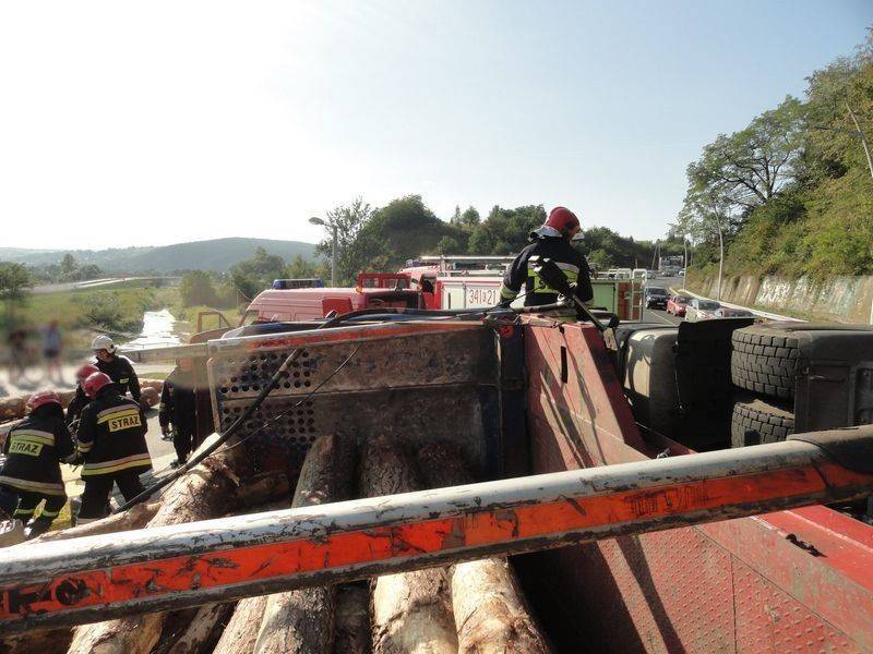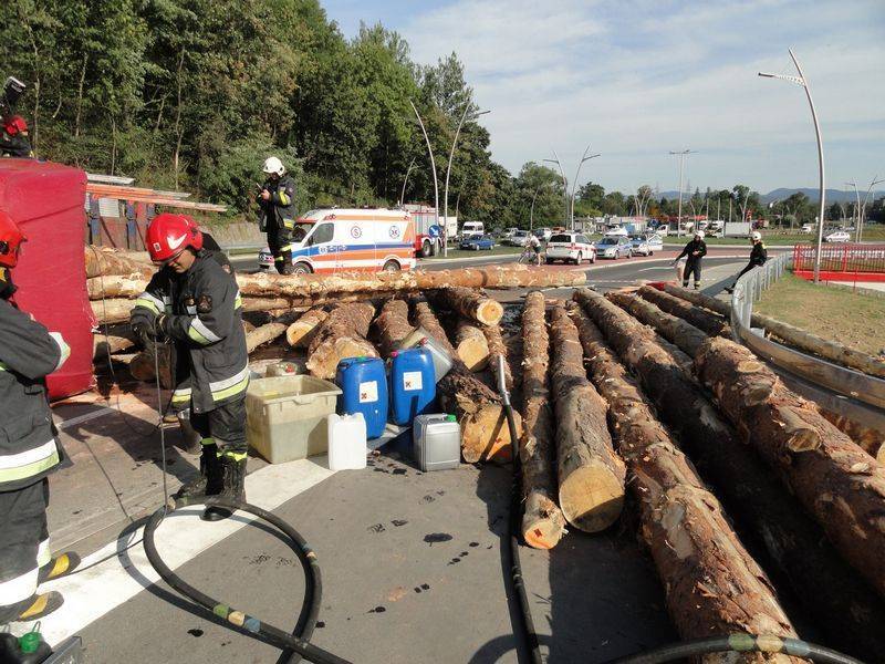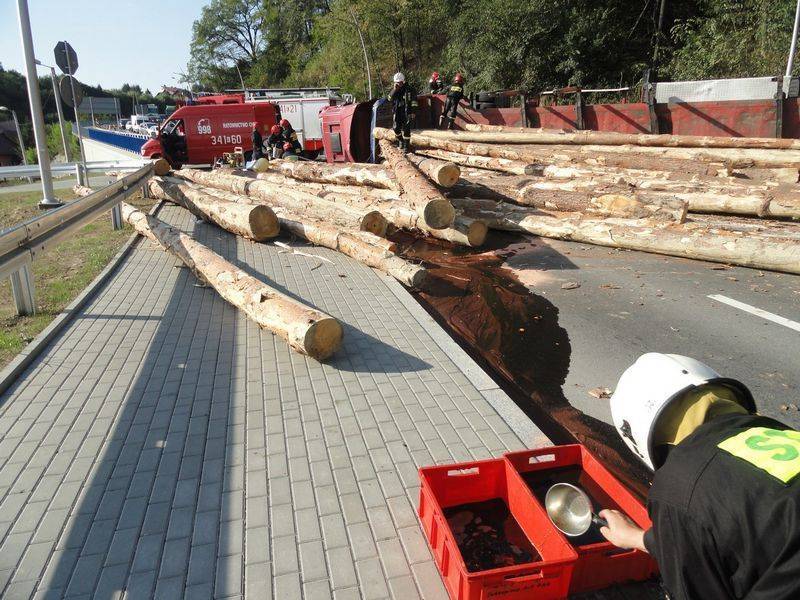 Ze zbiorników z paliwem wylewało się na drogę paliwo, które zostało zasypane sorbentem przez strażaków. Pozostała część paliwa została przepompowana do zbiornika zastępczego. Do przewoźnika należało zabezpieczenie zastępczego samochodu oraz dźwigu do załadunku drewna leżącego na drodze. Działania prowadziła specjalistyczna grupa ratownictwa chemicznego z JRG nr 1 w Nowym Sączu.
