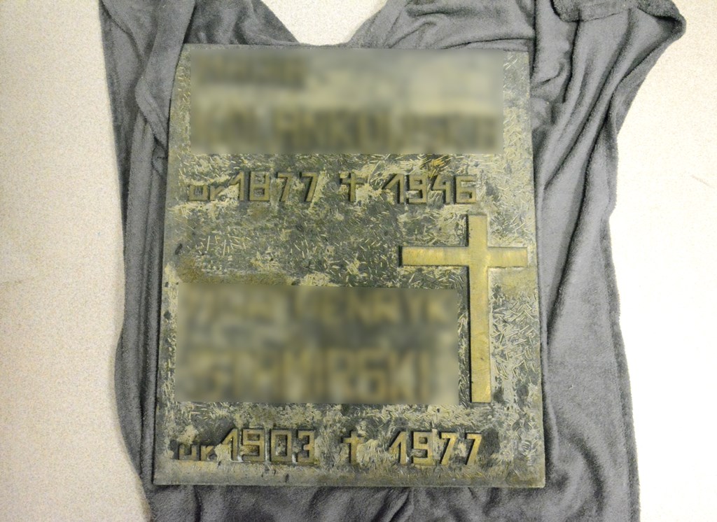 W trakcie dalszych czynności policjanci ustalili, że mosiężna płyta upamiętniająca m.in. znanego badacza historii Ziemi Sądeckiej została skradziona z nagrobka znajdującego się na terenie cmentarza komunalnego w Nowym Sączu.