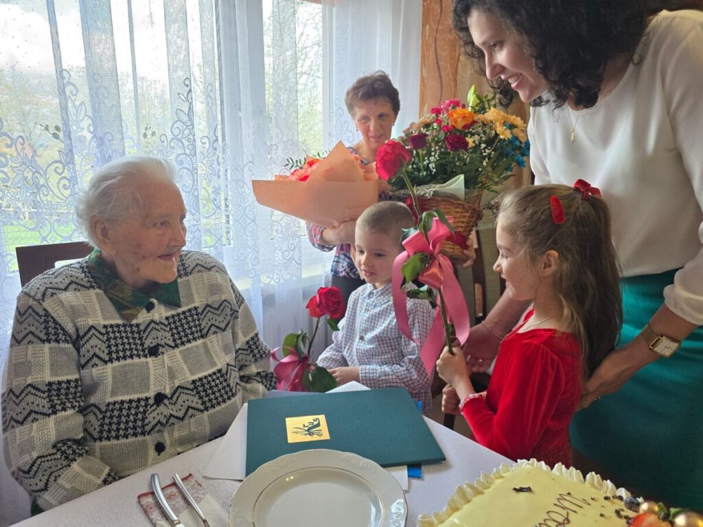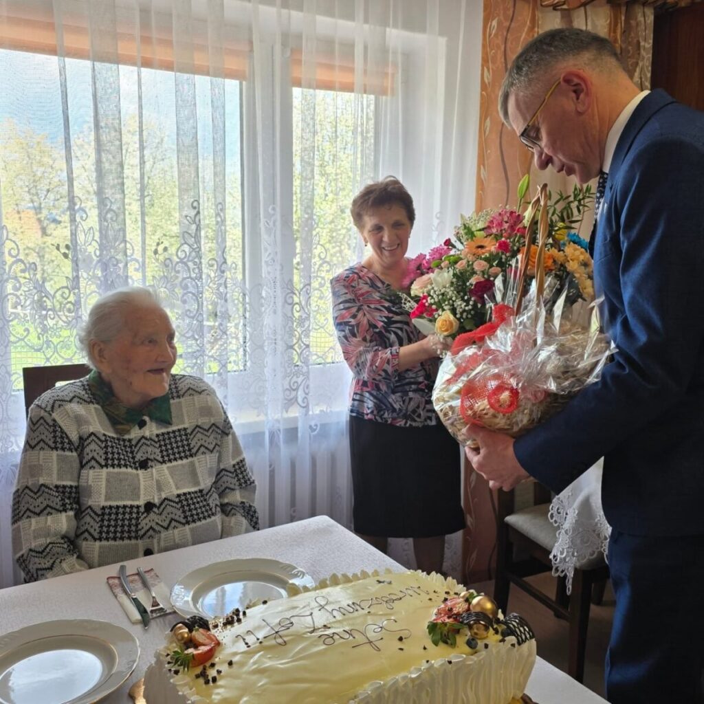Z wizytą do Pani Zofii przybyli również przedstawiciele władz samorządowych. Burmistrz Jacek Lelek oraz kierownik Urzędu Stanu Cywilnego Alfreda Wastag osobiście złożyli gratulacje, przekazując wyrazy uznania i szacunku. Do życzeń dołączyła także delegacja Kasy Rolniczego Ubezpieczenia Społecznego.