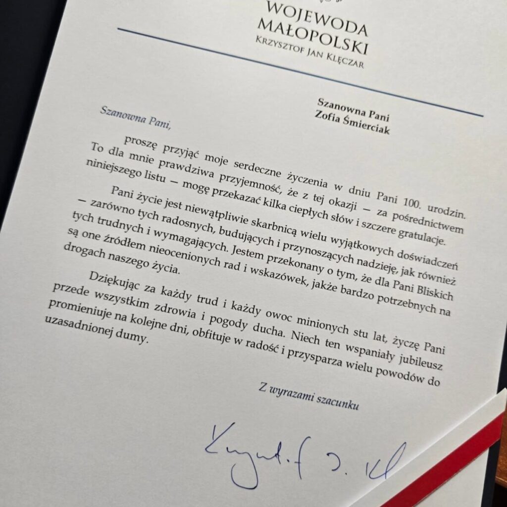 Szczególnym wyróżnieniem był list gratulacyjny od Prezesa Rady Ministrów Donald Tusk, a także życzenia od Wojewody Małopolskiego Krzysztof Kleczar. W przesłanych słowach podkreślono, że osiągnięcie tak pięknego wieku jest przywilejem dostępnym nielicznym. Zwrócono również uwagę na szczególną rolę seniorów jako strażników wartości i pamięci pokoleń.