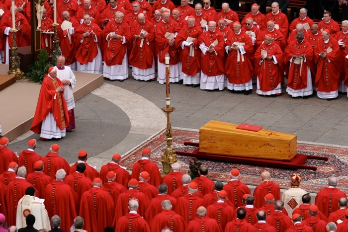 Pogrzeb Jana Pawła II odbył się w piątek 8 kwietnia 2005 r. Trumnę z prostych desek z drewna cyprysowego (symbolu nieśmiertelności) ustawiono wprost na rozłożonym na bruku placu św. Piotra dywanie.