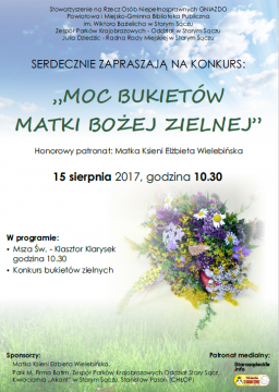Po raz trzeci w Starym Sączu Stowarzyszenie na Rzecz Osób Niepełnosprawnych Gniazdo organizuje KONKURS na najpiękniejszy bukiet zielny. Współorganizatorami tego wydarzenia jest: Powiatowa i Miejsko-Gminna Biblioteka Publiczna im Wiktora Bazielicha w Starym Sączu, Zespół Parków Krajobrazowych (Oddział w Starym Sączu) i Julia Dziedzic Radna Rady Miejskiej w Starym Sączu.