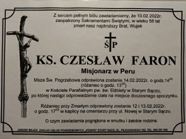 10 lutego 2022 roku zmarł śp. Ks. Czesław Faron – misjonarz w Peru. Msza święta pogrzebowa w poniedziałek (14 lutego) o godz. 14.00 w kościele parafialnym pw. św. Elżbiety Węgierskiej w Starym Sączu, po której ciało Zmarłego zostanie złożone na miejscowym cmentarzu.