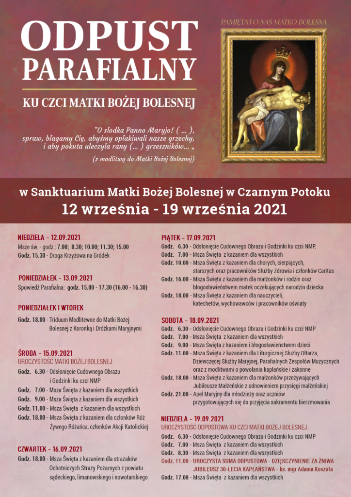 Już wkrótce, bo 12 września rozpocznie się Odpust ku czci Matki Bożej Bolesnej w Jej Sanktuarium w Czarnym Potoku. Będzie on trwać do niedzieli 19 września. Zwieńczeniem będzie uroczysta suma o godzinie 11:00, na której dziękować będziemy za tegoroczne żniwa oraz plony ziemi.