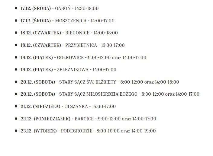 Spowiedź z okazji Świąt Bożego Narodzenia w sobotę (20 grudnia) od 8.00 do 18.00 z przerwami: 10.00-10.30; 12.00-14.00; 16.00-16.30. Komunia Święta będzie udzielana w Domu Parafialnym, tam też będzie spowiedź dla osób niedosłyszących. W tym dniu Akcja Katolicka rozprowadza stroiki świąteczne.