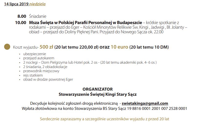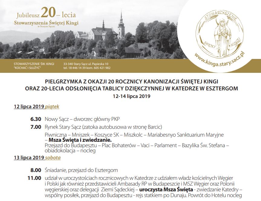 • ufundowanie i przekazanie jedynej pamiątki z Kanonizacji w Starym Sączu a poświęconej osobiście przez Jana Pawła II – Tablicy z napisem po polsku i węgiersku z wizerunkiem Św. Kingi- „NARODOWI WĘGIERSKIEMU ZIEMIA SĄDECKA” umieszczonej 24.07.1999 r. w Katedrze w Esztergom. W roku 2019 będziemy świętować 20- lecie jej umieszczenia;