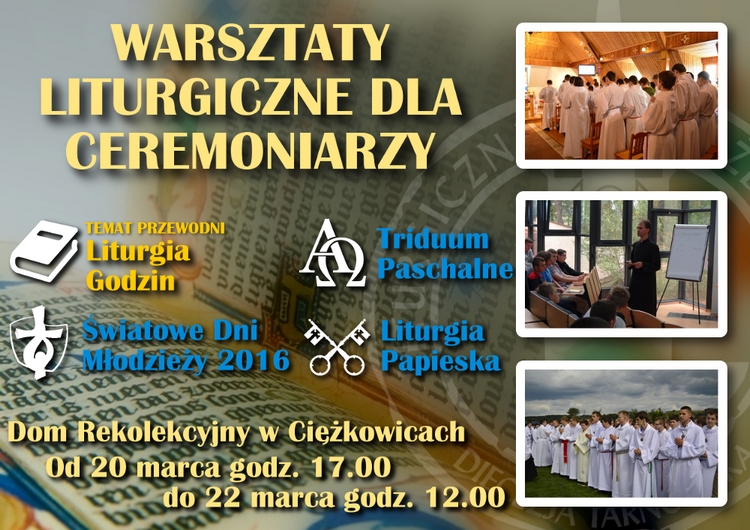 Ceremoniarzy wszystkich roczników zapraszamy na „Warsztaty liturgiczne dla ceremoniarzy”, które odbędą się Domu Rekolekcyjnym w Ciężkowicach odbędą się w dniach: 20 – 22 marca 2015 r. Warsztaty te przewidziane są raz w roku celem zintegrowania środowiska ceremoniarzy i pogłębiania dalszej formacji.