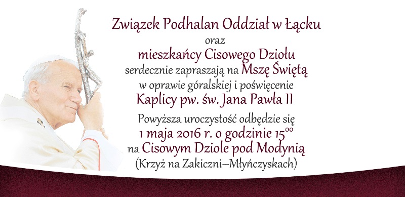 Związek Podhalan Oddział w Łącku i Mieszkańcy Cisowego Dziołu serdecznie zapraszają na Mszę Św., która odprawiona zostanie 1 maja o godz. 15.00 na Cisowym Dziole pod Modynią. Msza Św. połączona będzie z poświęceniem nowo wybudowanego ołtarza i kaplicy.