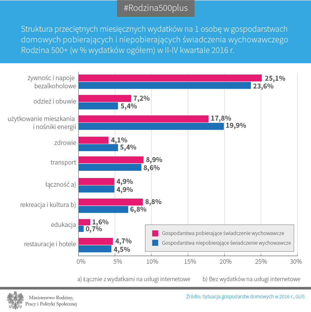 Uruchomione od 1 kwietnia 2016 r. świadczenie wychowawcze „Rodzina 500+” stanowiło przeciętnie w gospodarstwach domowych otrzymujących to świadczenie 16,8% dochodów rozporządzalnych na 1 osobę (na podstawie wyników za II–IV kwartał.).