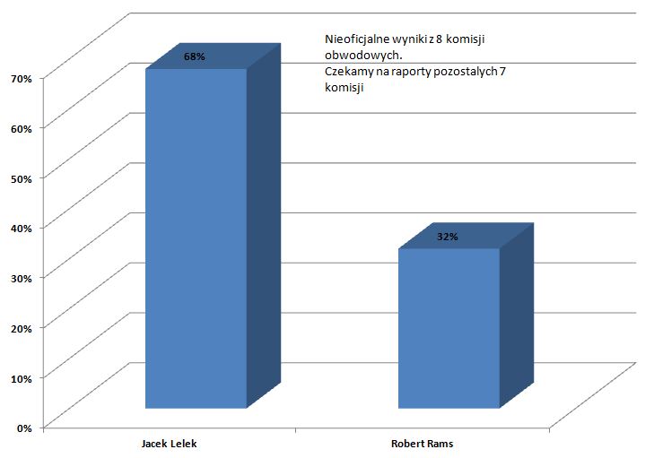 Jacek Lelek prowadzi w tegorocznych wyborach samorządowych o fotel burmistrza w Starym Sączu, stosunkiem głosów 68 % do 32 %. To szczątkowe wyniki z 8 komisji. Brakuje jeszcze raportów z 7 komisji. Liczenie głosów  jeszcze trwa. Wszystko jest więc możliwe. W sztabach wyborczych kandydatów panuje gorąca atmosfera.