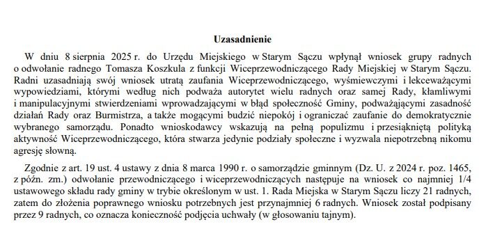 W uzasadnieniu wniosku radni wskazują na utratę zaufania do Wiceprzewodniczącego. Jak czytamy, Tomasz Koszkul miał dopuścić się „wyśmiewczych i lekceważących wypowiedzi”, które ich zdaniem godziły w autorytet nie tylko poszczególnych radnych, ale i całej Rady Miejskiej. Zarzucają mu również formułowanie „kłamliwych i manipulacyjnych stwierdzeń”, które miały wprowadzać mieszkańców gminy w błąd i podważać zasadność działań zarówno Rady, jak i Burmistrza Starego Sącza. Wnioskodawcy twierdzą także, że aktywność Tomasza Koszkula ma „charakter populistyczny i przesiąknięty polityką”, a jej efektem są jedynie podziały społeczne i wzrost napięcia w debacie publicznej.