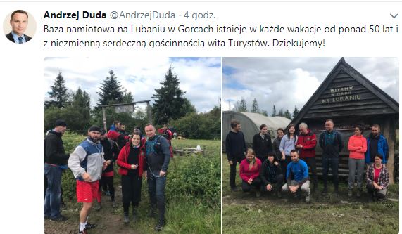 Przy okazji głowa państwa promuje bazę namiotową na Lubaniu w Gorcach.