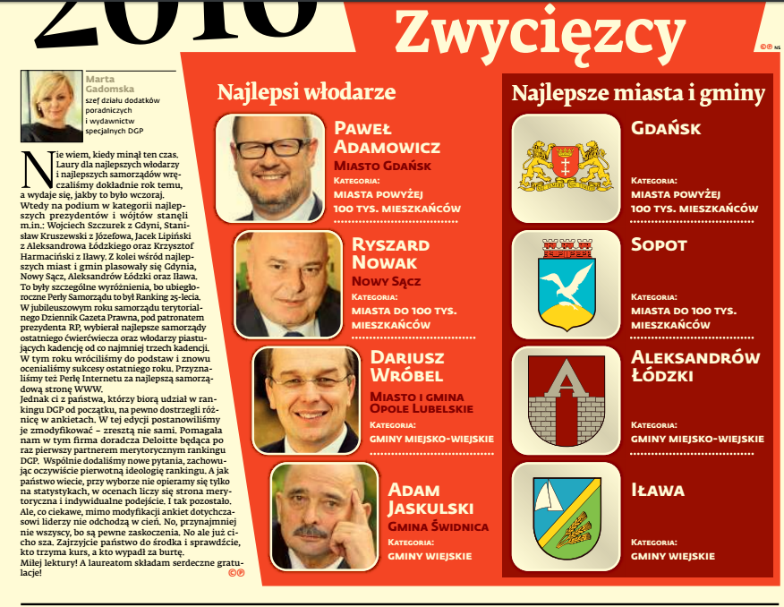 Kapituła organizowanego przez Dziennik Gazetę Prawną, przy wsparciu merytorycznym międzynarodowej firmy doradczej Deloitte, Rankingu „Perły Samorządu”, przyznaje nagrody w czterech kategoriach: