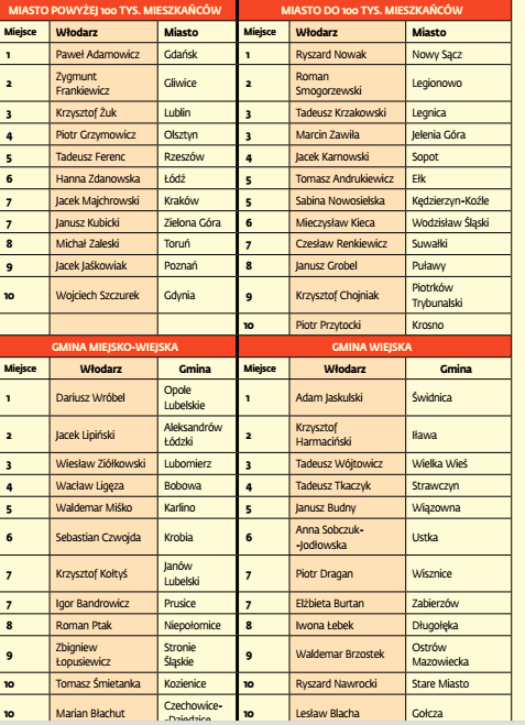 Wśród laureatów w poszczególnych kategoriach znaleźli się m.in. Prezydent Gdańska Paweł Adamowicz, Prezydent Lublina Krzysztof Żuk oraz Prezydent Gliwic Zygmunt Frankiewicz. Natomiast w gronie najlepszych miast znalazły się m.in. Gdańsk, Olsztyn, Gliwice, Sopot i Kędzierzyn-Koźle.