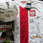 -reprezentacji Polski w piłce nożnej-koszulka i piłka  meczowa z podpisami między innymi Lewandowskiego, Szczęsnego, Krychowiaka i Boruca.