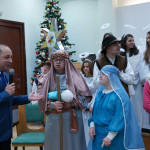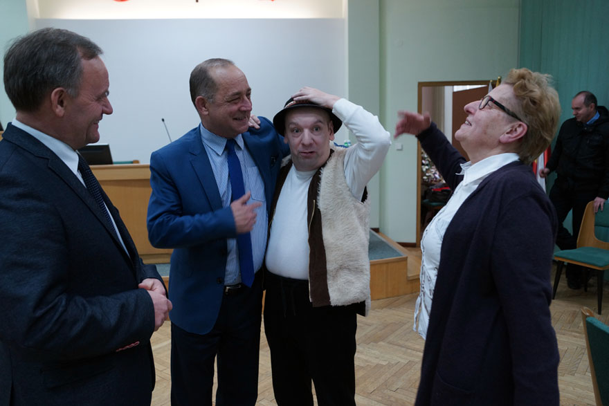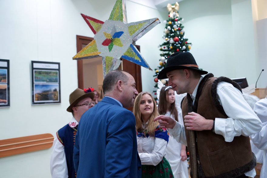 Teatr działa od ośmiu lat i integruje młodzież przez sztukę. Blisko 30-osobowy zespół tworzą osoby niepełnosprawne oraz uczniowie starosądeckich szkół. Młodzi aktorzy w minioną sobotę wystąpili podczas noworocznego spotkania z sołtysami w Starostwie Powiatowym. Dziś pokazali, co potrafią  gospodarzom powiatu – staroście nowosądeckiemu Markowi Pławiakowi, wicestaroście Antoniemu Koszykowi oraz pracownikom urzędu. – Miałem okazję podziwiać wasz występ w sobotę, dzisiaj także obejrzałem go z wielką przyjemnością –  mówił do aktorów Marek Pławiak. Razem z Antonim Koszykiem w nagrodę za jasełkowe przedstawienie obdarował młodzież słodyczami.