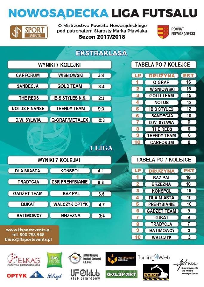 Rozegrano siódmą kolejkę Nowosądeckiej Ligi Futsalu w dwóch klasach rozgrywkowych Ekstraklasie i 1 Lidze. W ostatni weekend strzelono 84 gole w dziesięciu meczach, co daje średnią 8,4 gola na spotkanie.