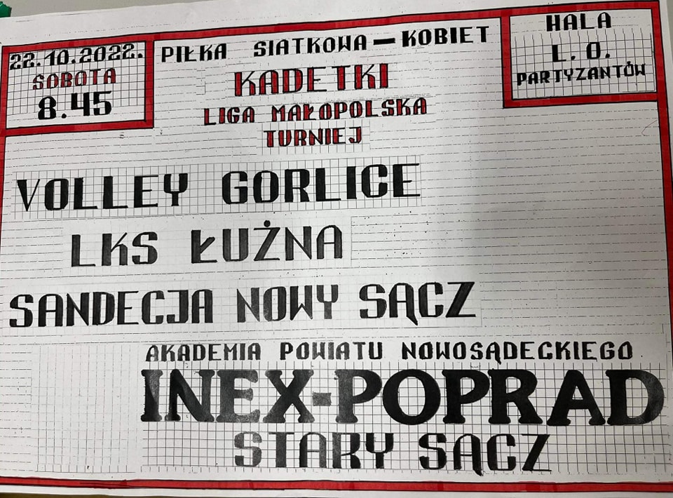 Dzisiaj (22.10.2022) na hali sportowej przy Liceum Ogólnokształcącym im. Marii Skłodowskiej-Curie w Starym Sączu (Partyzantów 15) rozpoczyna się turniej piłki siatkowej kadetek -Liga Małopolska.