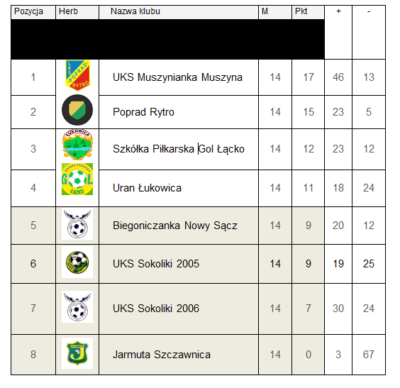 Całą Ligę wygrywa Muszynianka z dorobkiem 26 pkt, drugie miejsca dla Popradu Rytro – 20 pkt, SP Gol Łącko 13 pkt zajęło trzecią lokatę, a czwarta przypadła Uranowi Łukowica z dorobkiem również 13 pkt.