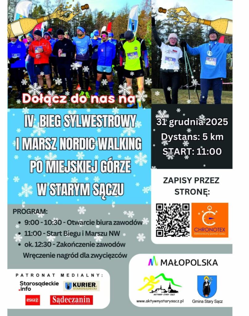Stowarzyszenie Aktywny Stary Sącz zaprasza wszystkich miłośników sportu, ruchu i dobrej zabawy do udziału w IV Biegu Sylwestrowym oraz marszu Nordic Walking po Miejskiej Górze. To już czwarta edycja tego wyjątkowego wydarzenia, które na stałe wpisało się w kalendarz sportowych imprez w gminie Stary Sącz.
