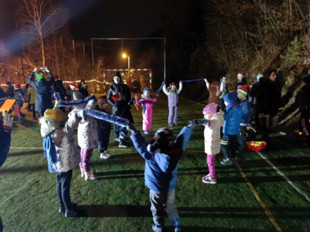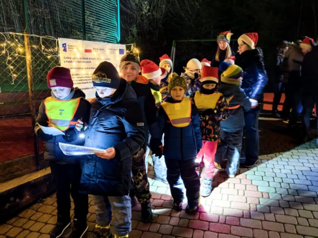 W pewnym momencie podczas zabawy na boisku szkolnym dzieci usłyszały dzwoneczek i zobaczyły w oddali św. Mikołaj, który zrobił psikusa i minął naszą szkołę. Teraz dał dzieciom czas na jego odnalezienie…… Pod opieką Nauczycieli oraz Straży Pożarnej bezpiecznie można było ruszyć w teren! Wszyscy uczestnicy zostali podzieleni na grupy i wraz z wychowawcami oraz mapą w ręce ruszyli na poszukiwanie. Uczniowie ubrani w odblaskowe stroje przy okazji propagowali bezpieczne poruszanie się późną porą.