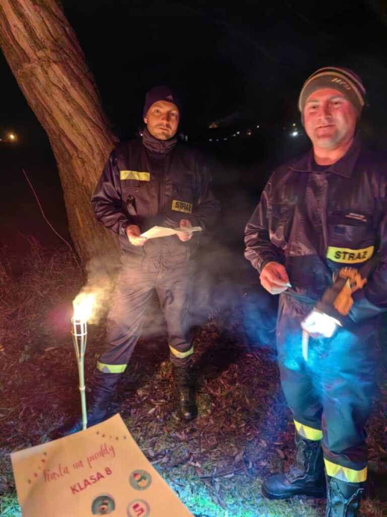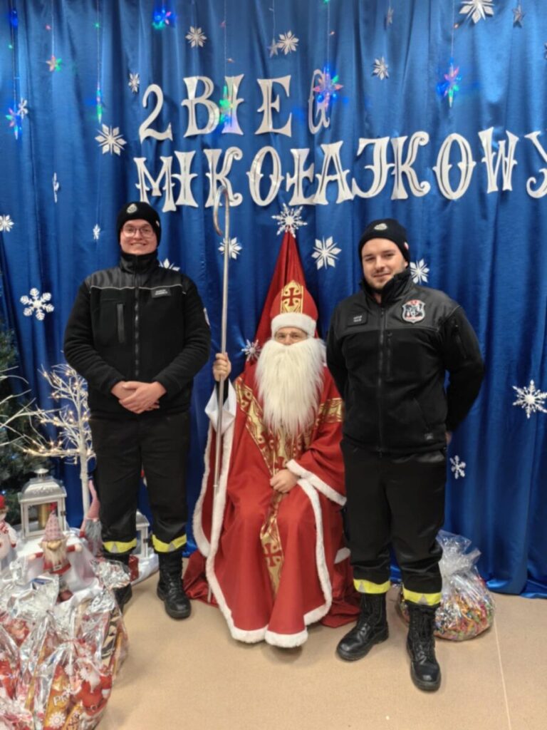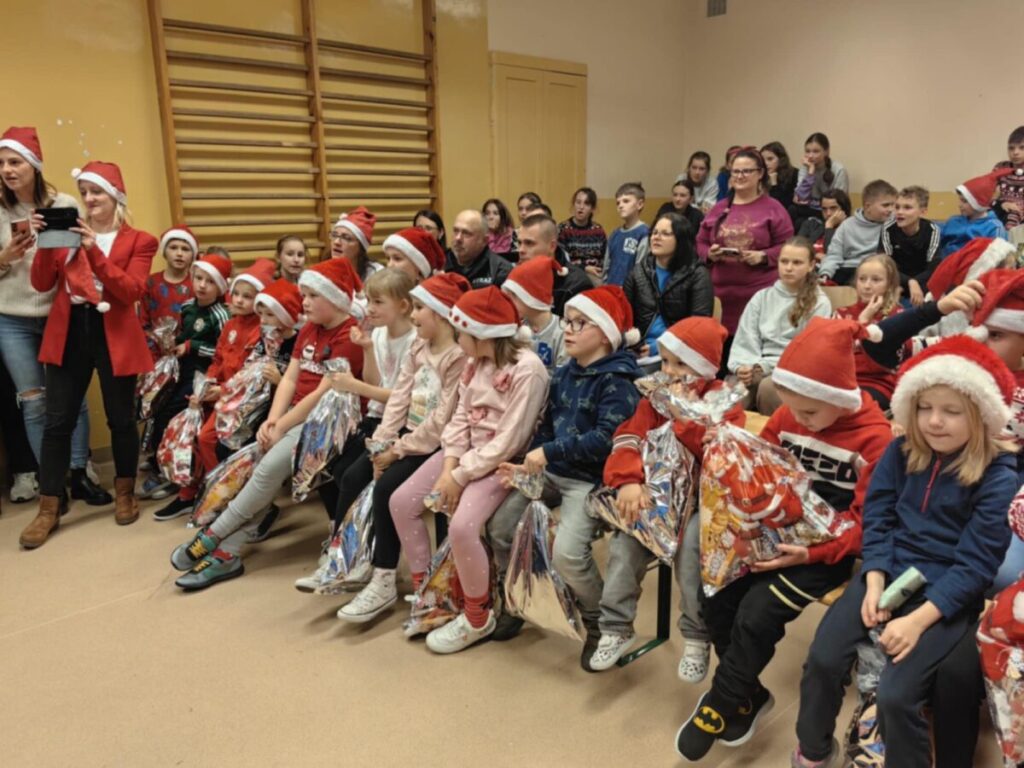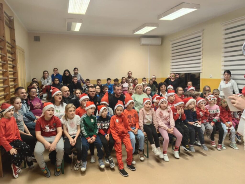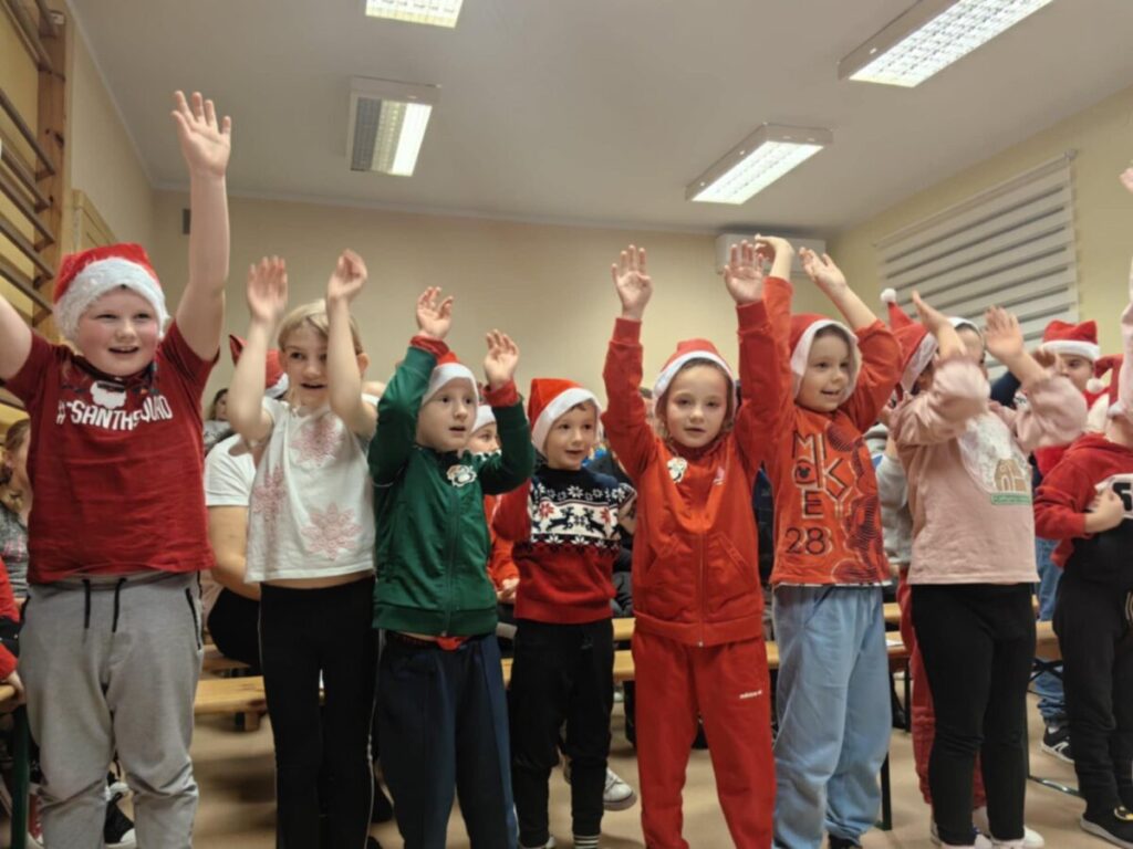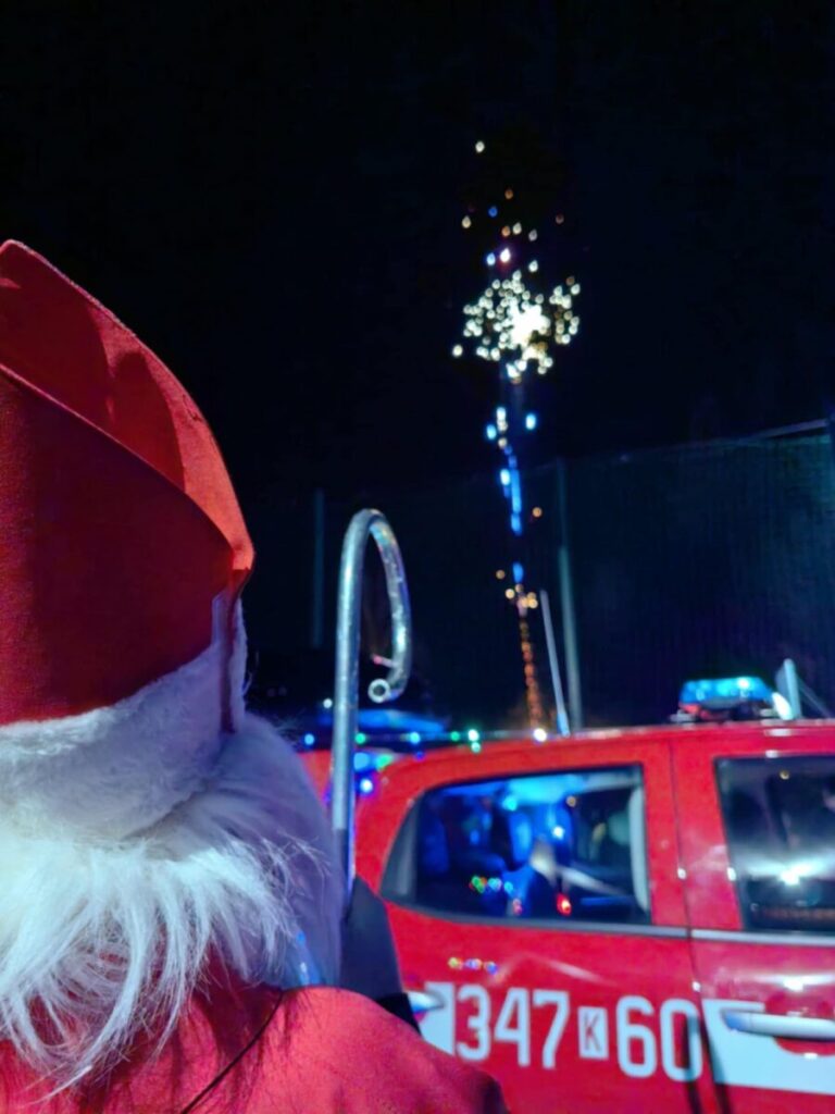 Zgodnie z wyznaczoną trasą realizowali przygotowane zadania, a po ich wykonaniu wszyscy wrócili do szkoły na gorący posiłek. Następnie w dwóch grupach młodszych i starszych dzieci oglądali filmy świąteczne, aż do momentu, gdy rozległ się dźwięk syreny strażackiej i wszyscy z ciekawością wybiegli na podwórko szkolne. A tam na niebie rozbłysły fajerwerki i na plac szkolny wjechał samochód strażacki, a w nim… poszukiwany św. Mikołaj, który w asyście dzieci przeszedł do budynku szkoły, w którym powitano go piosenkami.