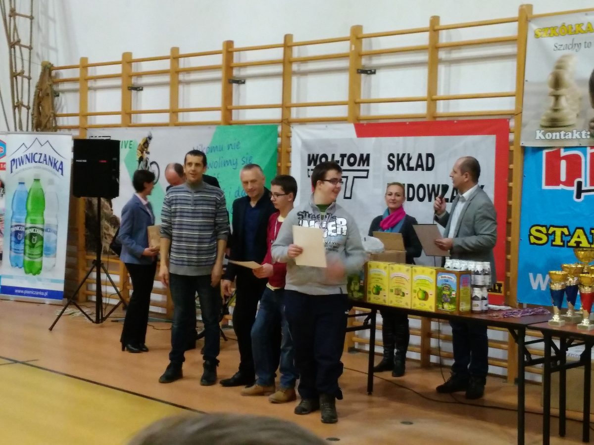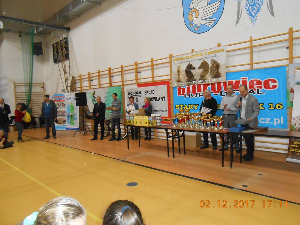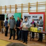 Po wręczeniu pucharów i medali w klasyfikacji generalnej nastąpiło losowanie nagród. Najbardziej wartościowe nagrody rozlosowano wśród zawodników z młodzieżowych grup, którzy wzięli udział we wszystkich 5 turniejach, następnie pozostałe nagrody losowano wśród graczy biorących udział w sobotnim turnieju. Do wygrania były: nagroda główna – rower, ufundowana przez Wojciech Steca – Firma Woj- Tom Aktiv. Dwa zestawy głośników, tablet, 2 telefony dotykowe, 21 power bank, 6 x myszka optyczna, 10 spinnerow, 4 pendrive, 6 kompletów słuchawek, 4 talony do Pizzerii w Tegoborzy ( Mateusz Franczyk – przedszkole w Łącku – Kraina Uśmiechu ), 3 bony do Salonu Fryzjerskiego Glamour, 6 bonów do sklepu Woj – Tom ( Karolina Stec ), woda mineralna – Piwniczanka ( Pani Agnieszka Pióro ) ,4 bony do sklepu Plechta ( Mateusz Plechta ), 36 kubków od firmy Biurowiec, soki Tłoczni Maurer ( Krzysztof Maurer ) oraz książki o Gminie Łącko ( Gmina Łącko ). Każdy uczestnik dostał pamiątkowy brelok ufundowany przez firmę Biurowiec Pani Anny i Grzegorza Baran. Drożdżówki dla każdego uczestnika sponsorowała firma GS w Łącku w osobie Pana Antoniego Barana. Kawę, herbatę , oraz posiłki dla zaproszonych gości , sponsorów i organizatorów wraz z pysznym ciastem zapewniła Restauracja Pod Jabłonią ( Pani Celina Pierzchała oraz Franczyk Józef ). Dziękujemy także Panu Leszkowi Myjakowi ( Lester- Trans ) , Panu Tomaszowi Kurowskiemu ( Ekspertcom ) oraz Robertowi S. ( Kadcza ) za wsparcie finansowe w przeprowadzeniu turnieju 🙂 .