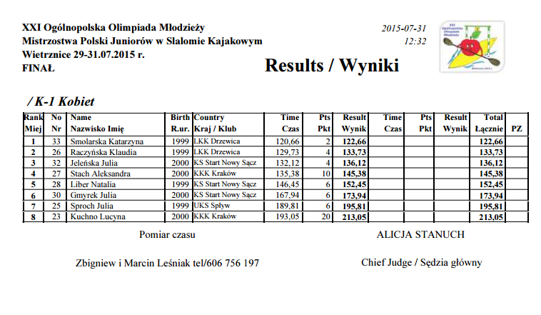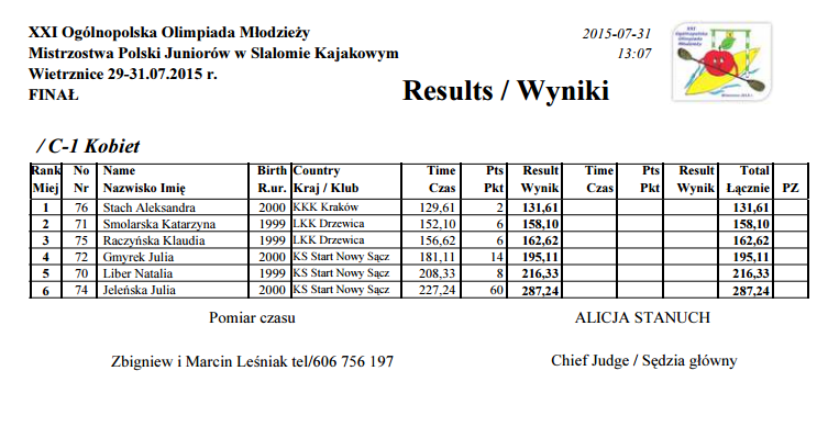 - 1 miejsce Stach Aleksandra KKK Kraków
